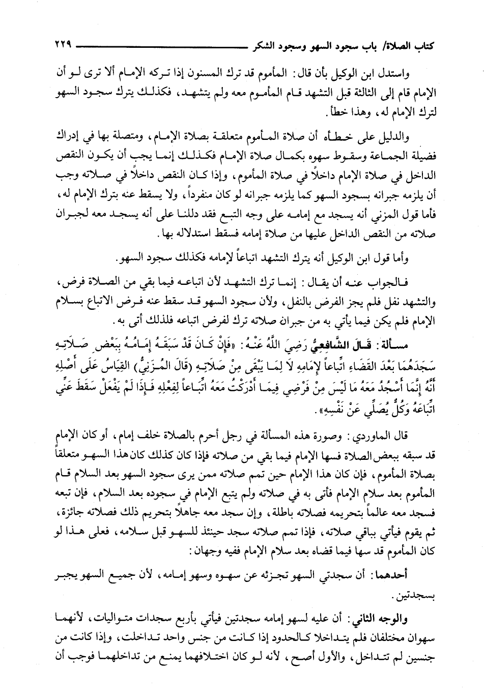 والدليل على خطأه أَنَّ صَلَاةَ الْمَأْمُومِ مُتَعَلِّقَةٌ بِصَلَاةِ الْإِمَامِ، وَمُتَّصِلَةٌ بِهَا فِي إِدْرَاكِ فَضِيلَةِ الْجَمَاعَةِ وَسُقُوطِ سَهْوِهِ بِكَمَالِ صَلَاةِ الْإِمَامِ فَكَذَلِكَ إِنَّمَا يَجِبُ أَنْ يَكُونَ النَّقْصُ الدَّاخِلُ فِي صَلَاةِ الْإِمَامِ دَاخِلًا فِي صَلَاةِ الْمَأْمُومِ، وَإِذَا كَانَ النَّقْصُ دَاخِلًا فِي صَلَاتِهِ وَجَبَ أَنْ يَلْزَمَهُ جُبْرَانُهُ بِسُجُودِ السَّهْوِ كَمَا يَلْزَمُهُ جُبْرَانُهُ لَوْ كَانَ مُنْفَرِدًا، وَلَا يَسْقُطُ عَنْهُ بِتَرْكِ الْإِمَامِ لَهُ، فَأَمَّا قَوْلُ الْمُزَنِيِّ أَنَّهُ يَسْجُدُ مَعَ إِمَامِهِ عَلَى وَجْهِ التَّبَعِ فَقَدْ دَلَّلْنَا عَلَى أَنَّهُ يَسْجُدُ معه لجبران صلاته من النقض الدَّاخِلِ عَلَيْهَا مِنْ صَلَاةِ إِمَامِهِ فَسَقَطَ اسْتِدْلَالُهُ بها