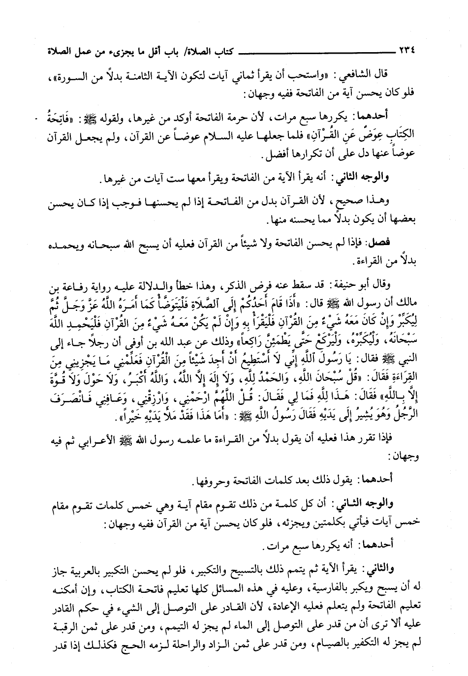 : فَإِذَا لَمْ يُحْسِنِ الْفَاتِحَةَ وَلَا شَيْئًا مِنَ الْقُرْآنِ فَعَلَيْهِ أَنْ يُسَبِّحَ اللَّهَ سُبْحَانَهُ وَيَحْمَدَهُ بَدَلًا مِنَ الْقِرَاءَةِ
