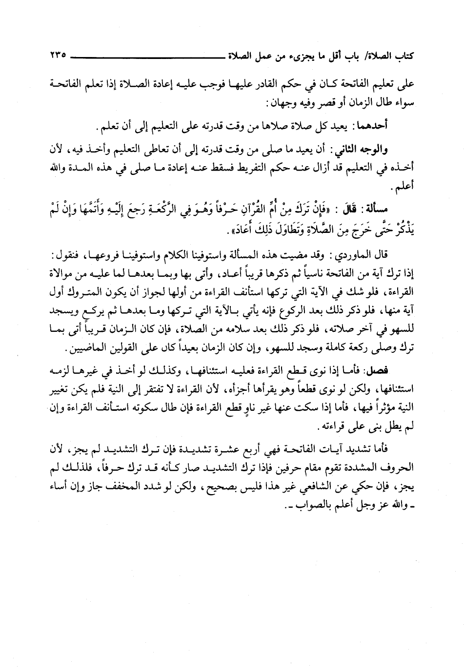 قال الماوردي: وقد مضيت هَذِهِ الْمَسْأَلَةَ وَاسْتَوْفَيْنَا الْكَلَامَ وَاسْتَوْفَيْنَا فُرُوعَهَا، فَنَقُولُ: إِذَا تَرَكَ آيَةً مِنَ الْفَاتِحَةِ نَاسِيًا ثُمَّ ذَكَرَهَا قَرِيبًا أَعَادَ، وَأَتَى بِهَا وَبِمَا بَعْدَهَا لِمَا عَلَيْهِ مِنْ مُوَالَاةِ الْقِرَاءَةِ، فَلَوْ شَكَّ فِي الْآيَةِ الَّتِي تَرَكَهَا اسْتَأْنَفَ الْقِرَاءَةَ مِنْ أَوَّلِهَا لِجَوَازِ أَنْ يَكُونَ الْمَتْرُوكُ أَوَّلَ آيَةٍ مِنْهَا، فَلَوْ ذَكَرَ ذَلِكَ بَعْدَ الرُّكُوعِ فَإِنَّهُ يَأْتِي بِالْآيَةِ الَّتِي تَرَكَهَا وَمَا بَعْدَهَا ثُمَّ يَرْكَعُ وَيَسْجُدُ لِلسَّهْوِ فِي آخِرِ صَلَاتِهِ، فَلَوْ ذَكَرَ ذَلِكَ بَعْدَ سَلَامِهِ مِنَ الصَّلَاةِ، فَإِنْ كَانَ الزَّمَانُ قَرِيبًا أَتَى بِمَا تَرَكَ وَصَلَّى رَكْعَةً كَامِلَةً وَسَجَدَ لِلسَّهْوِ، وَإِنْ كَانَ الزَّمَانُ بَعِيدًا كَانَ عَلَى الْقَوْلَيْنِ الْمَاضِيَيْنِ