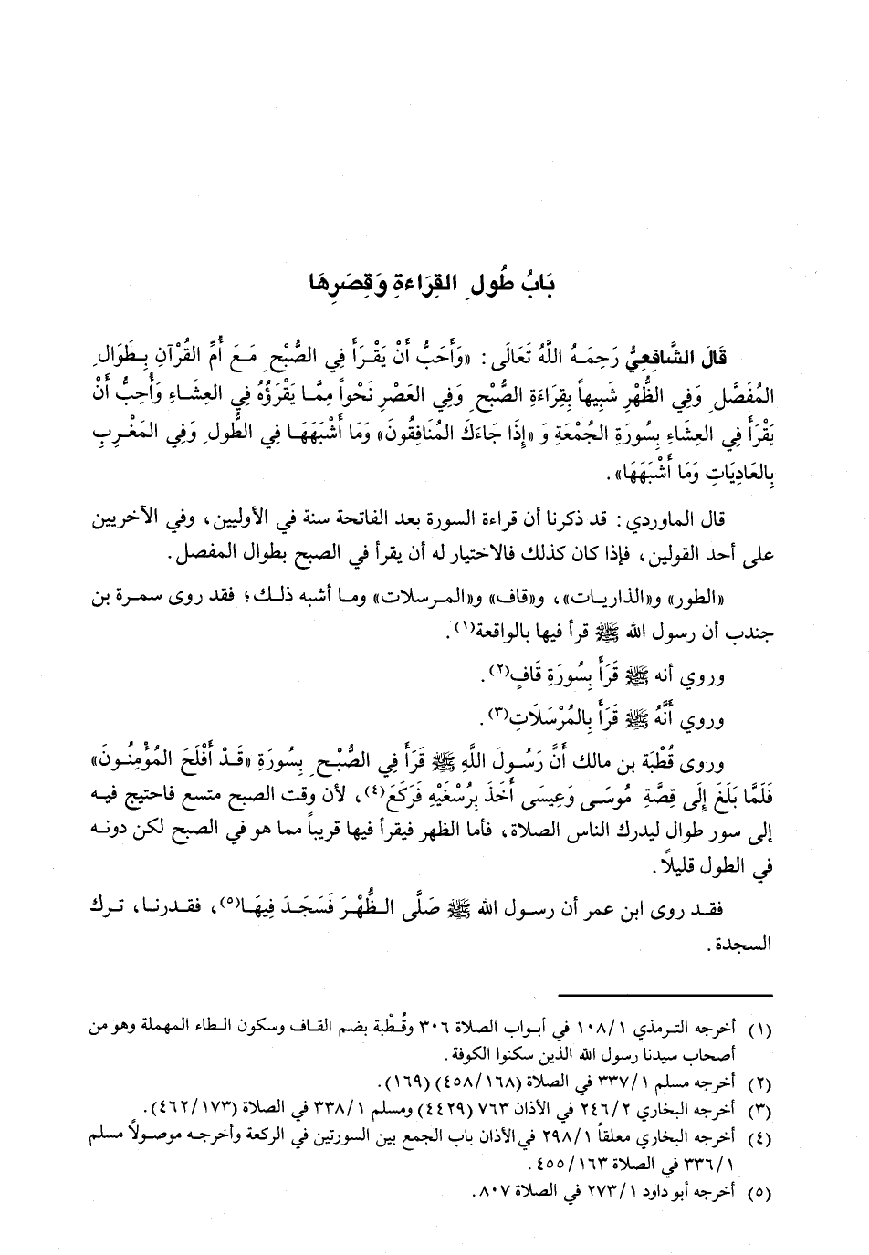 قال الشافعي رحمه الله تعالى: " وَأُحِبُّ أَنْ يَقْرَأَ فِي الصُّبْحِ مَعَ أُمِّ القرآن بطوال الْمُفَصَّلِ وَفِي الظُّهْرِ شَبِيهًا بِقِرَاءَةِ الصُّبْحِ وَفِي العصر نحواً مما يقرؤه فِي الْعِشَاءِ وَأُحِبُّ أَنْ يَقْرَأَ فِي الْعِشَاءِ بسورة الجمعة و {إذا جاءك المنافقون} وَمَا أَشْبَهَهَا فِي الطُّولِ وَفِي الْمَغْرِبِ بالعاديات وما أشبهها "