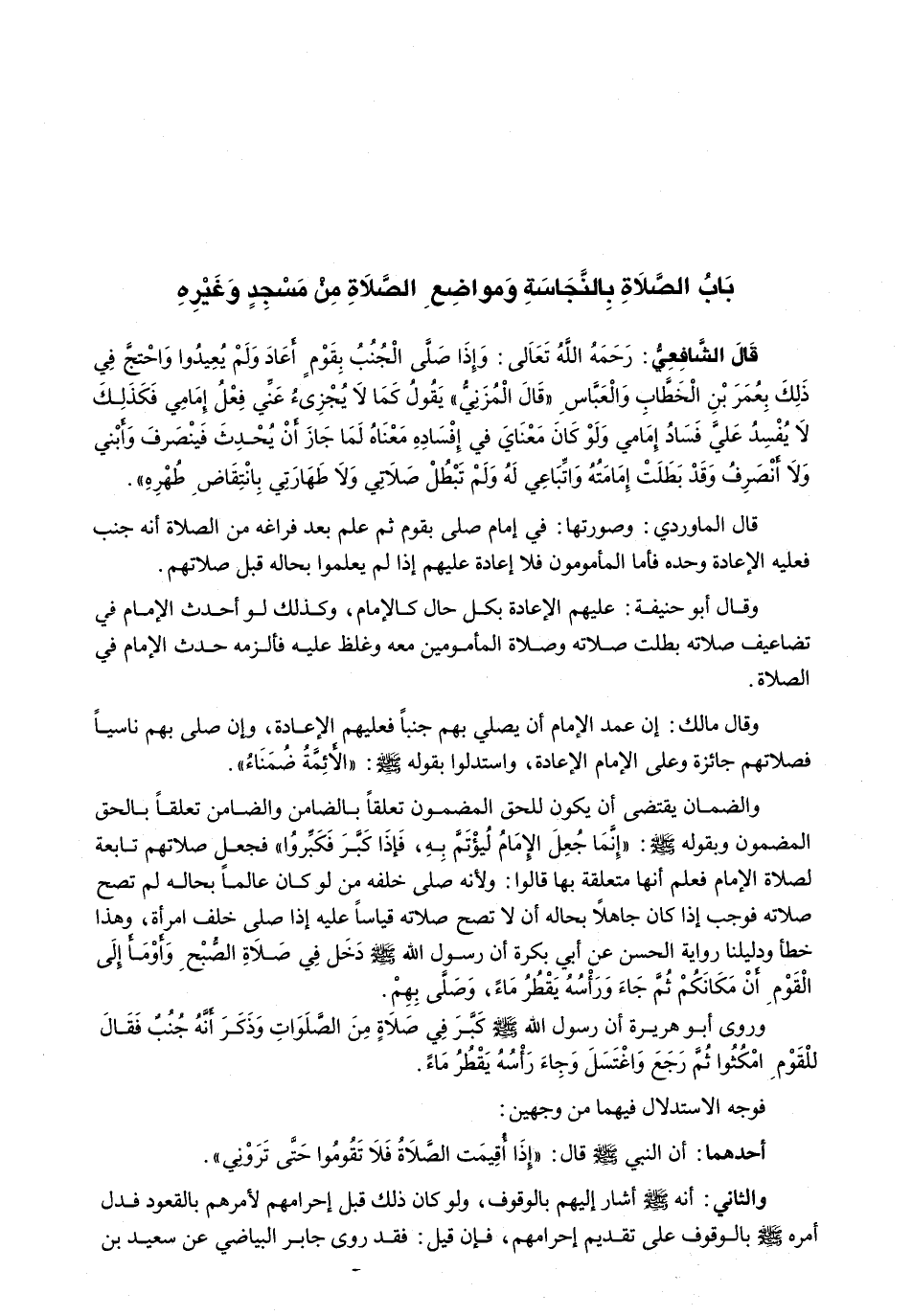 وَقَالَ مَالِكٌ: إِنْ عَمَدَ الْإِمَامُ أَنْ يُصَلِّيَ بِهِمْ جُنُبًا فَعَلَيْهِمُ الْإِعَادَةُ، وَإِنْ صَلَّى بِهِمْ نَاسِيًا فَصَلَاتُهُمْ جَائِزَةٌ وَعَلَى الْإِمَامِ الْإِعَادَةُ، وَاسْتَدَلُّوا بِقَوْلِهِ - صَلَّى اللَّهُ عَلَيْهِ وَسَلَّم َ - " الْأَئِمَّةُ ضُمَنَاءُ " وَالضَّمَانُ يَقْتَضِي أَنْ يَكُونَ لِلْحَقِّ الْمَضْمُونِ تَعَلُّقًا بِالضَّامِنِ وَالضَّامِنِ تَعَلُّقًا بِالْحَقِّ الْمَضْمُونِ وبقوله - صَلَّى اللَّهُ عَلَيْهِ وَسَلَّم َ -: " إِنَّمَا جُعِلَ الْإِمَامُ لِيُؤْتَمَّ بِهِ، فَإِذَا كَبَّرَ فَكَبِّرُوا " فَجَعَلَ صَلَاتَهُمْ تَابِعَةً لِصَلَاةِ الْإِمَامِ فَعُلِمَ أَنَّهَا مُتَعَلِّقَةٌ بِهَا قَالُوا: وَلِأَنَّهُ صَلَّى خَلْفَهُ مَنْ لَوْ كَانَ عَالِمًا بِحَالِهِ لَمْ تَصِحَّ صَلَاتُهُ فَوَجَبَ إِذَا كَانَ جَاهِلًا بِحَالِهِ أَنْ لَا تَصِحَّ صَلَاتُهُ قِيَاسًا عَلَيْهِ إِذَا صَلَّى خَلْفَ امْرَأَةٍ، وَهَذَا خَطَأٌ وَدَلِيلُنَا رِوَايَةُ الْحَسَنِ عَنْ أَبِي بَكْرَةَ أَنَّ رَسُولَ اللَّهِ - صَلَّى اللَّهُ عَلَيْهِ وَسَلَّم َ - دَخَلَ فِي صَلَاةِ الصُّبْحِ وَأَوْمَأَ إِلَى الْقَوْمِ أَنْ مَكَانَكُمْ ثُمَّ جَاءَ وَرَأْسُهُ يَقْطُرُ مَاءً، وَصَلَّى بِهِمْ وَرَوَى أَبُو هُرَيْرَةَ أَنَّ رَسُولَ اللَّهِ - صَلَّى اللَّهُ عَلَيْهِ وَسَلَّم َ - كَبَّرَ فِي صلاةٍ مِنَ الصَّلَوَاتِ وَذَكَرَ أَنَّهُ جُنُبٌ فَقَالَ لِلْقَوْمِ امْكُثُوا ثُمَّ رَجَعَ وَاغْتَسَلَ وَجَاءَ رَأْسُهُ يَقْطُرُ مَاءً