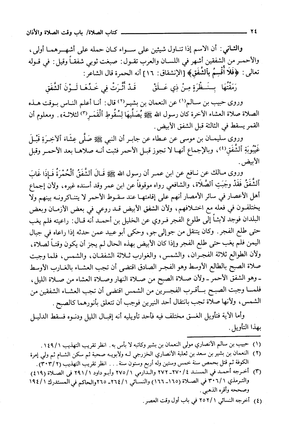 وَرَوَى حَبِيبُ بْنُ سَالِمٍ عَنِ النُّعْمَانِ بْنِ بَشِيرٍ قَالَ: أَنَا أَعْلَمُ النَّاسِ بِوَقْتِ هَذِهِ الصَّلَاةِ صَلَاةِ الْعِشَاءِ الْآخِرَةِ كَانَ رَسُولُ اللَّهِ - صَلَّى اللَّهُ عَلَيْهِ وَسَلَّم َ - يُصَلِّيهَا لِسُقُوطِ الْقَمَرِ لِثَلَاثَةٍ ". وَمَعْلُومٌ أَنَّ الْقَمَرَ يَسْقُطُ فِي الثَّالِثَةِ قَبْلَ الشَّفَقِ الْأَبْيَضِ.