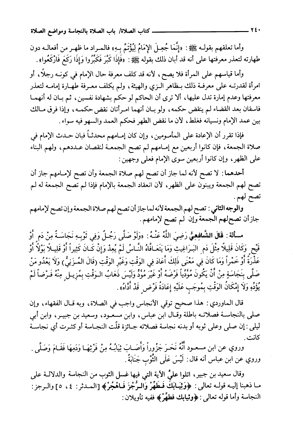 قَالَ الْمَاوَرْدِيُّ: هَذَا صَحِيحٌ تَوَقِّي الْأَنْجَاسِ وَاجِبٌ فِي الصَّلَاةِ، وَبِهِ قَالَ الْفُقَهَاءُ، وَإِنْ صَلَّى بِالنَّجَاسَةِ فَصَلَاتُهُ بَاطِلَةٌ وَقَالَ ابْنُ عَبَّاسٍ، وَابْنُ مَسْعُودٍ، وَسَعِيدُ بْنُ جُبَيْرٍ، وَابْنُ أَبِي لَيْلَى: إِنْ صَلَّى وَعَلَى ثَوْبِهِ أَوْ بَدَنِهِ نَجَاسَةٌ فَصَلَاتُهُ جَائِزَةٌ قَلَّتِ النَّجَاسَةُ أَوْ كَثُرَتْ أَيُّ نَجَاسَةٍ كَانَتْ