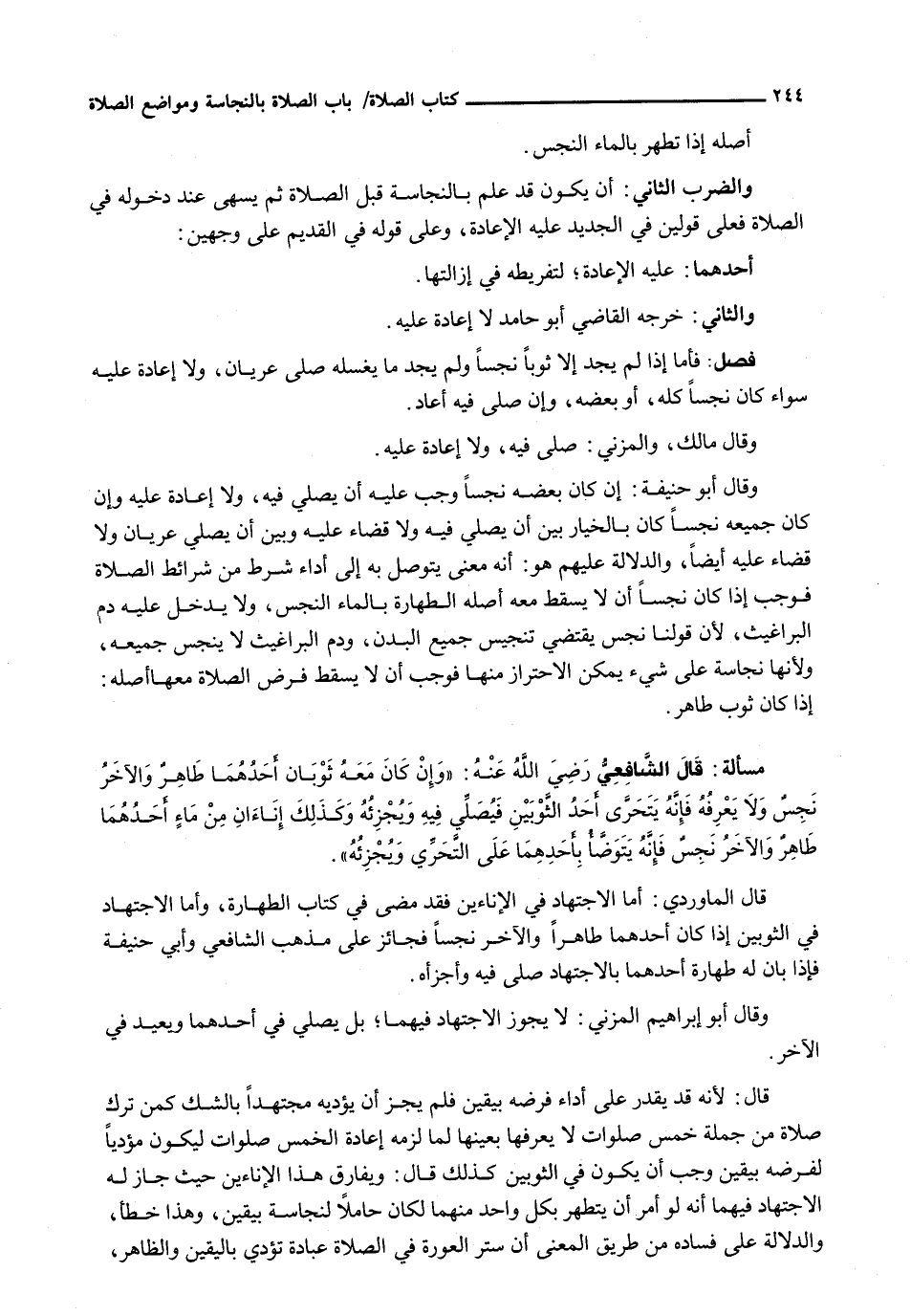 قَالَ الْمَاوَرْدِيُّ: أَمَّا الِاجْتِهَادُ فِي الْإِنَاءَيْنِ فَقَدْ مَضَى فِي كِتَابِ الطَّهَارَةِ، وَأَمَّا الِاجْتِهَادُ فِي الثَّوْبَيْنِ إِذَا كَانَ أَحَدُهُمَا طَاهِرًا وَالْآخَرُ نَجِسًا فَجَائِزٌ عَلَى مَذْهَبِ الشَّافِعِيِّ وأبي حنيفة فَإِذَا بَانَ لَهُ طَهَارَةُ أَحَدِهِمَا بِالِاجْتِهَادِ صَلَّى فِيهِ وَأَجْزَأَهُ