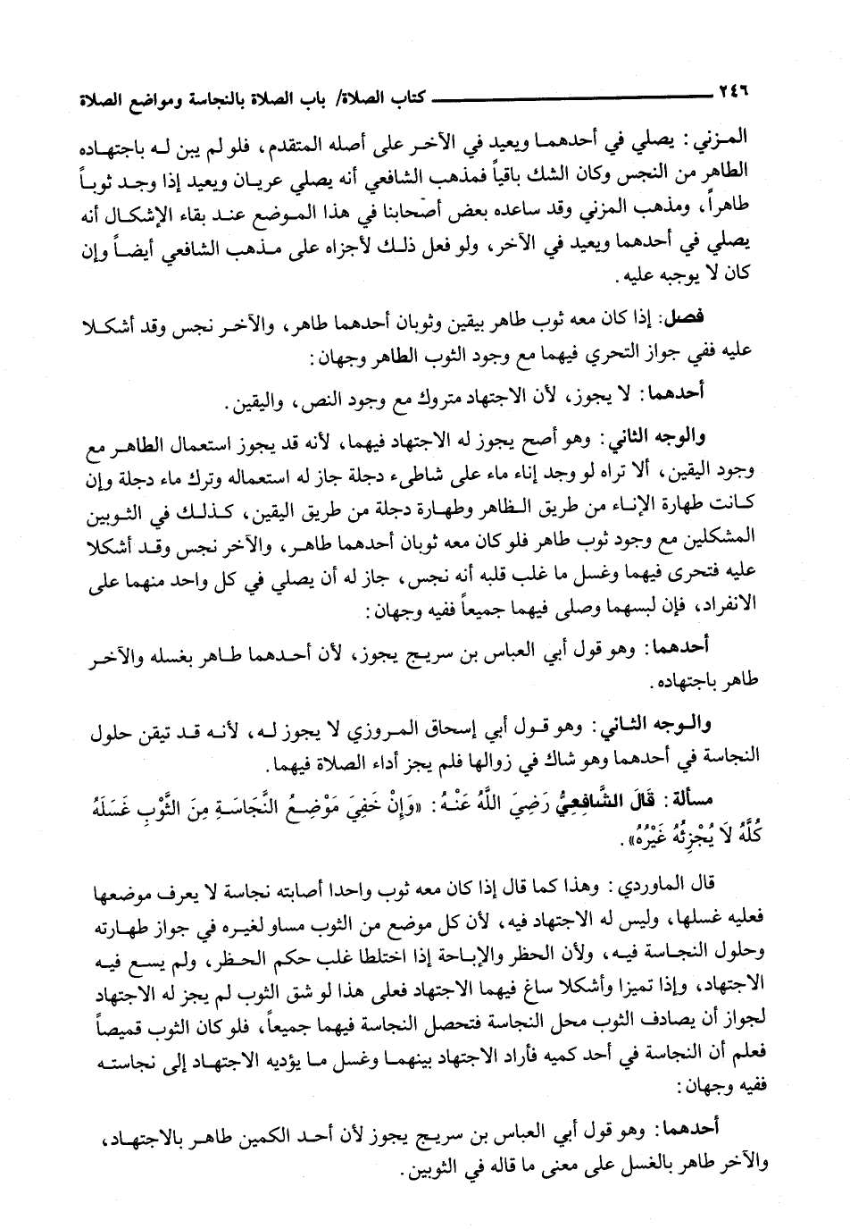الْمُزَنِيِّ: يُصَلِّي فِي أَحَدِهِمَا وَيُعِيدُ فِي الْآخَرِ عَلَى أَصْلِهِ الْمُتَقَدِّمِ، فَلَوْ لَمْ يَبِنْ لَهُ باجتهاد الطَّاهِرُ مِنَ النَّجَسِ وَكَانَ الشَّكُّ بَاقِيًا فَمَذْهَبُ الشافعي أنه يصلي عريان وَيُعِيدُ إِذَا وَجَدَ ثَوْبًا طَاهِرًا، وَمَذْهَبُ الْمُزَنِيِّ وقد ساعده بعض أصحابنا في هذا الموضع عِنْدَ بَقَاءِ الْإِشْكَالِ أَنَّهُ يُصَلِّي فِي أَحَدِهِمَا وَيُعِيدُ فِي الْآخَرِ، وَلَوْ فَعَلَ ذَلِكَ لَأَجْزَاهُ عَلَى مَذْهَبِ الشَّافِعِيِّ أَيْضًا وَإِنْ كَانَ لَا يُوجِبُهُ عَلَيْهِ