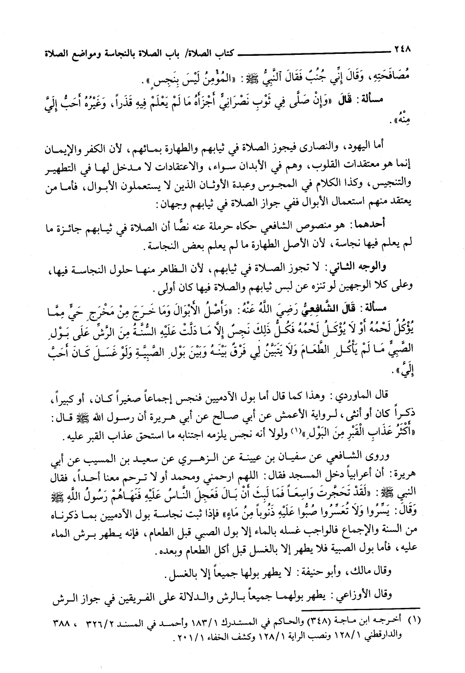 وَرَوَى الشَّافِعِيُّ عَنْ سُفْيَانَ بْنِ عُيَيْنَةَ عَنِ الزُّهْرِيِّ عَنْ سَعِيدِ بْنِ الْمُسَيَّبِ عَنْ أَبِي هُرَيْرَةَ: أَنَّ أَعْرَابِيًّا دَخَلَ الْمَسْجِدَ فقال: اللهم ارحمني ومحمد أو لا تَرْحَمْ مَعَنَا أَحَدًا، فَقَالَ النَّبِيُّ - صَلَّى اللَّهُ عَلَيْهِ وَسَلَّم َ -: " لَقَدْ تَحَجَّرْتَ وَاسِعًا فَمَا لَبِثَ أَنْ بَالَ فَعَجِلَ النَّاسُ عَلَيْهِ فَنَهَاهُمْ رَسُولُ اللَّهِ - صَلَّى اللَّهُ عَلَيْهِ وَسَلَّم َ - وَقَالَ: يَسِّرُوا وَلَا تُعَسِّرُوا صُبُّوا عَلَيْهِ ذَنُوبًا مِنْ مَاءٍ " فَإِذَا ثَبَتَ نَجَاسَةُ بَوْلِ الْآدَمِيِّينَ بِمَا ذَكَرْنَاهُ مِنَ السُّنَّةِ وَالْإِجْمَاعِ فَالْوَاجِبُ غَسْلُهُ بِالْمَاءِ إِلَّا بَوْلَ الصَّبِيِّ قَبْلَ الطَّعَامِ، فَإِنَّهُ يُطَهَّرُ بِرَشِّ الْمَاءِ عَلَيْهِ، فَأَمَّا بَوْلُ الصَّبِيَّةِ فَلَا يَطْهُرُ إِلَّا بِالْغَسْلِ قَبْلَ أَكْلِ الطَّعَامِ وَبَعْدَهُ