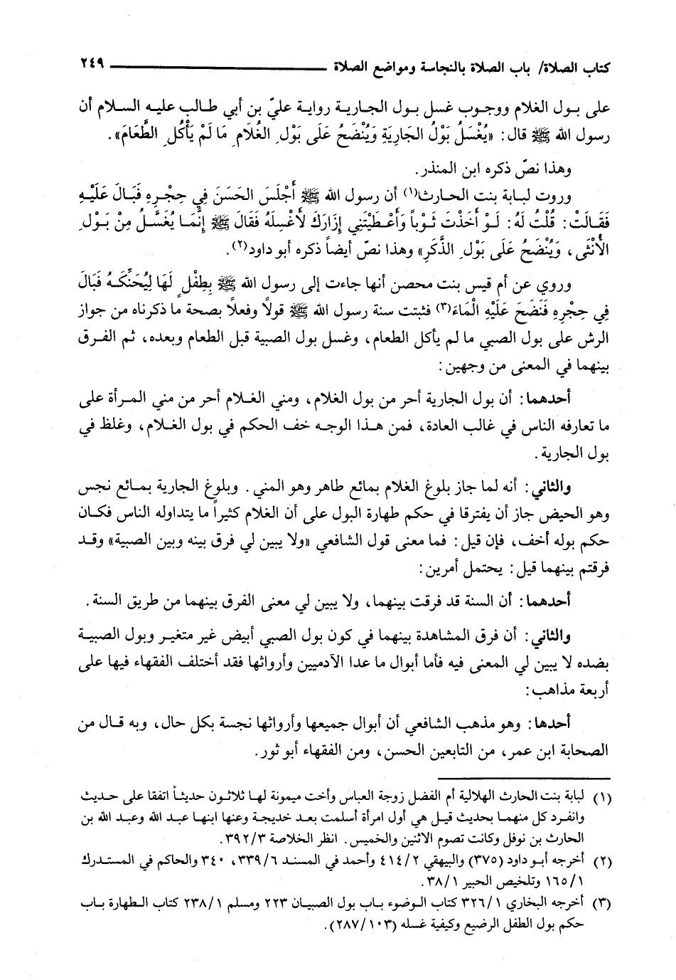 وَرَوَتْ لُبَابَةُ بِنْتُ الْحَارِثِ أَنَّ رَسُولَ اللَّهِ - صَلَّى اللَّهُ عَلَيْهِ وَسَلَّم َ - أَجْلَسَ الْحَسَنَ فِي حِجْرِهِ فَبَالَ عَلَيْهِ فَقَالَتْ: قُلْتُ لَهُ: لَوْ أَخَذْتَ ثَوْبًا وَأَعْطَيْتَنِي إِزَارَكَ لأغسله فقال - صَلَّى اللَّهُ عَلَيْهِ وَسَلَّم َ - إِنَّمَا يُغْسَلُ مِنْ بَوْلِ الْأُنْثَى، وَيُنْضَحُ عَلَى بَوْلِ الذَّكَرِ " وَهَذَا نَصٌّ أَيْضًا ذَكَرَهُ أَبُو دَاوُدَ