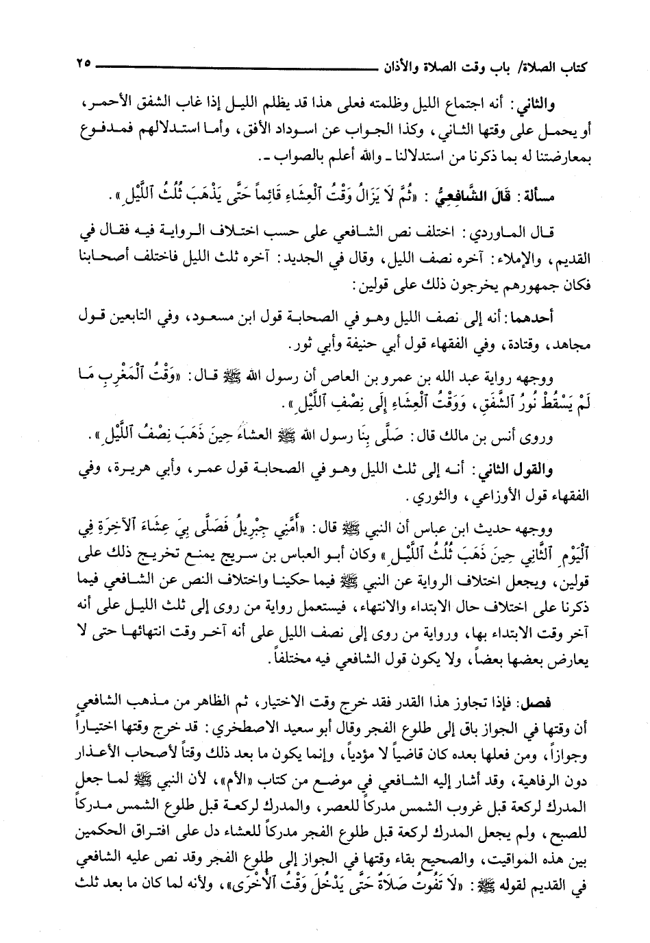 : فَإِذَا تَجَاوَزَ هَذَا الْقَدْرَ فَقَدْ خَرَجَ وَقْتُ الِاخْتِيَارِ، ثُمَّ الظَّاهِرُ مِنْ مَذْهَبِ الشَّافِعِيِّ أَنَّ وَقْتَهَا فِي الْجَوَازِ بَاقٍ إِلَى طُلُوعِ الْفَجْرِ وَقَالَ أَبُو سَعِيدٍ الْإِصْطَخَرِيُّ: قَدْ خَرَجَ وَقْتُهَا اخْتِيَارًا وَجَوَازًا، وَمَنْ فَعَلَهَا بَعْدَهُ كَانَ قَاضِيًا لَا مُؤَدِّيًا، وَإِنَّمَا يَكُونُ مَا بَعْدَ ذَلِكَ وَقْتًا لِأَصْحَابِ الْأَعْذَارِ دُونَ الرَّفَاهِيَةِ، وَقَدْ أَشَارَ إِلَيْهِ الشَّافِعِيُّ فِي مَوْضِعٍ مِنْ كِتَابِ " الْأُمِّ " لِأَنَّ النَّبِيَّ - صَلَّى اللَّهُ عَلَيْهِ وَسَلَّم َ - لَمَّا جَعَلَ الْمُدْرِكَ لِرَكْعَةٍ قَبْلَ غُرُوبِ الشَّمْسِ مُدْرِكًا لِلْعَصْرِ، وَالْمُدْرِكَ لِرَكْعَةٍ قَبْلَ طُلُوعِ الشَّمْسِ مُدْرِكًا لِلصُّبْحِ، وَلَمْ يَجْعَلِ الْمُدْرِكَ لِرَكْعَةٍ قَبْلَ طُلُوعِ الْفَجْرِ مُدْرِكًا لِلْعَشَاءِ دَلَّ عَلَى افْتِرَاقِ الْحُكْمَيْنِ بَيْنَ هَذِهِ الْمَوَاقِيتِ، وَالصَّحِيحُ بَقَاءُ وَقْتِهَا فِي الْجَوَازِ إِلَى طُلُوعِ الْفَجْرِ وَقَدْ نَصَّ عَلَيْهِ الشَّافِعِيُّ فِي الْقَدِيمِ لِقَوْلِهِ - صَلَّى اللَّهُ عَلَيْهِ وَسَلَّم َ -: " لَا تَفُوتُ صَلَاةٌ حَتَّى يَدْخُلَ وَقْتُ الْأُخْرَى "، وَلِأَنَّهُ لَمَّا كَانَ مَا بَعْدَ ثُلْثِ