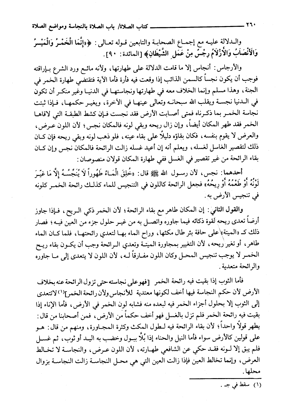 وَالْأَرْجَاسُ: أَنْجَاسٌ إِلَّا مَا قَامَتِ الدَّلَالَةُ عَلَى طَهَارَتِهَا، وَلِأَنَّهُ مَائِعٌ وَرَدَ الشَّرْعُ بِإِرَاقَتِهِ فَوَجَبَ أَنْ يَكُونَ نَجِسًا كَالسَّمْنِ الذَّائِبِ إِذَا وَقَعَتْ فِيهِ فَأْرَةٌ فَأَمَّا الْآيَةُ فَتَقْتَضِي طَهَارَةَ الْخَمْرِ فِي الْجَنَّةِ، وَهَذَا مُسَلَّمٌ وَإِنَّمَا الْخِلَافُ مَعَهُ فِي طَهَارَتِهَا وَنَجَاسَتِهَا فِي الدُّنْيَا وَغَيْرُ مُنْكَرٍ أَنْ تَكُونَ فِي الدُّنْيَا نَجِسَةً وَيَقْلِبُ اللَّهُ سُبْحَانَهُ وَتَعَالَى عَيْنَهَا فِي الْآخِرَةِ، وَيُغَيِّرُ حُكْمَهَا، فَإِذَا ثَبَتَتْ نَجَاسَةُ الْخَمْرِ بِمَا ذَكَرْنَاهُ فَمَتَى أَصَابَتِ الْأَرْضَ فَقَدْ نَجِسَتْ فَإِنْ كَشَطَ الطَّبَقَةَ الَّتِي لَاقَاهَا الْخَمْرُ فَقَدْ طَهَّرَ الْمَكَانَ أَيْضًا، وَإِنْ زَالَ رِيحُهُ وَبَقِيَ لَوْنُهُ فَالْمَكَانُ نَجِسٌ؛ لِأَنَّ اللَّوْنَ عَرَضٌ، وَالْعَرَضُ لَا يَقُومُ بِنَفْسِهِ، فَكَانَ بَقَاؤُهُ دَلِيلًا عَلَى بَقَاءِ عَيْنِهِ، فَلَوْ ذَهَبَ لَوْنُهُ وَبَقِيَ رِيحُهُ فَإِنْ كَانَ ذَلِكَ لِتَقْصِيرِ الْغَاسِلِ لِغَسْلِهِ، وَيَعْلَمُ أَنَّهُ إِنْ أُعِيدَ غَسْلُهُ زَالَتِ الرَّائِحَةُ فَالْمَكَانُ نَجِسٌ وَإِنْ كَانَ بَقَاءُ الرَّائِحَةِ مِنْ غير تقصير الْغَسْلِ فَفِي طَهَارَةِ الْمَكَانِ قَوْلَانِ مَنْصُوصَانِ: