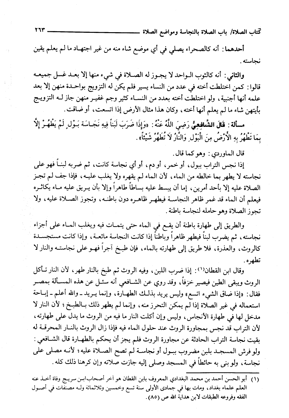 وَقَالَ ابْنُ الْقَطَّانِ: إِذَا ضُرِبَ اللَّبِنُ، وَفِيهِ الرَّوْثُ ثُمَّ طُبِخَ بِالنَّارِ طَهُرَ، لِأَنَّ النَّارَ تَأْكُلُ الرَّوْثَ وَيَبْقَى الطِّينُ فَيَصِيرُ خَزَفًا، وَقَدْ رُوِيَ عَنِ الشَّافِعِيِّ أَنَّهُ سُئِلَ عَنْ هَذِهِ الْمَسْأَلَةِ بِمِصْرَ فَقَالَ: " إِذَا ضَاقَ الشَّيْءُ اتَّسَعَ " وَلَيْسَ يُرِيدُ بِذَلِكَ الطَّهَارَةَ، وَإِنَّمَا يُرِيدُ - وَاللَّهُ أَعْلَمُ - إِبَاحَةَ اسْتِعْمَالِهِ فِي غَيْرِ الصَّلَاةِ إِذَا لَمْ يُمْكِنُ التَّحَرُّزُ مِنْهُ، وَإِنَّمَا لَمْ يَطْهُرْ ذَلِكَ بِالطَّبْخِ؛ لِأَنَّ النَّارَ لَا مَدْخَلَ لَهَا فِي طَهَارَةِ الْأَنْجَاسِ، وَلَيْسَ وَإِنْ أَكَلَتِ النَّارُ مَا فِيهِ مِنَ الرَّوْثِ مَا يَدُلُّ عَلَى طَهَارَتِهِ، لِأَنَّ التُّرَابَ قَدْ نَجِسَ بِمُجَاوَرَةِ الرَّوْثِ عِنْدَ حُلُولِ الْمَاءِ فِيهِ فَإِذَا زَالَ الروث بالنار المحروقة لَهُ بَقِيَتْ نَجَاسَةُ التُّرَابِ الْحَادِثَةُ عَنْ مُجَاوَرَةِ الرَّوْثِ فَلَمْ يَجُزْ أَنْ يَحْكُمَ بِالطَّهَارَةِ قَالَ الشَّافِعِيُّ: وَلَوْ فُرِشَ الْمَسْجِدُ بِلَبِنٍ مَضْرُوبٍ بِبَوْلٍ أَوْ نَجَاسَةٍ لَمْ تَصِحَّ الصَّلَاةُ عَلَيْهِ؛ لِأَنَّهُ مُصَلًّى عَلَى نَجَاسَةٍ، وَلَوْ بَنَى بِهِ حَائِطًا فِي الْمَسْجِدِ وَصَلَّى إِلَيْهِ جَازَتْ صَلَاتُهُ وَإِنْ كرهنا ذلك كله