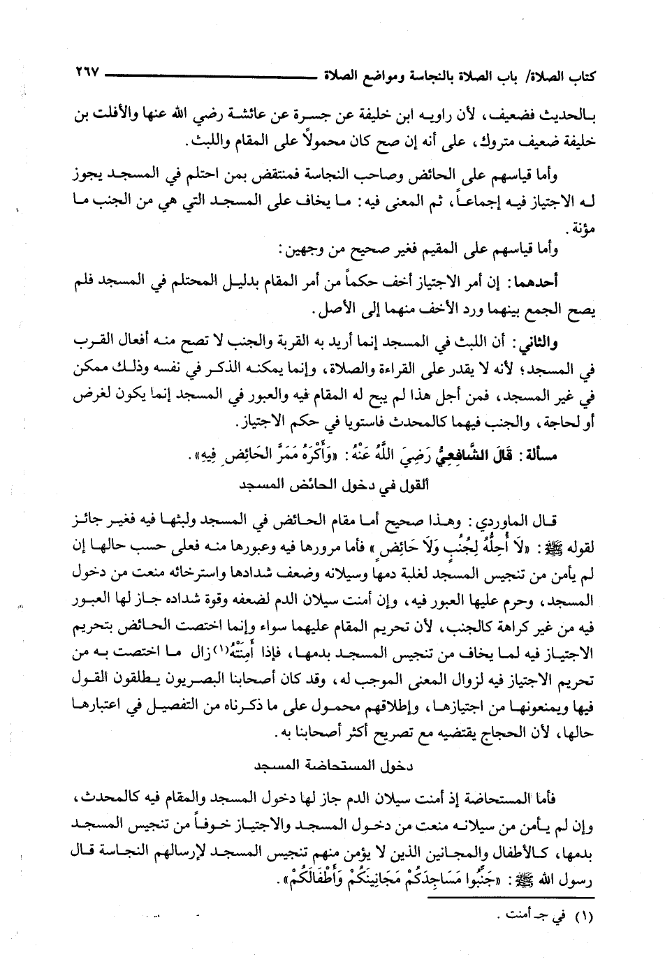 قَالَ الْمَاوَرْدِيُّ: وَهَذَا صَحِيحٌ أَمَّا مُقَامُ الْحَائِضِ فِي الْمَسْجِدِ وَلُبْثُهَا فِيهِ فَغَيْرُ جَائِزٍ لِقَوْلِهِ - صَلَّى اللَّهُ عَلَيْهِ وَسَلَّم َ -: " لَا أُحِلُّهُ لِجُنُبٍ وَلَا حَائِضٍ " فَأَمَّا مُرُورُهَا فِيهِ وَعُبُورُهَا مِنْهُ فَعَلَى حَسَبِ حَالِهَا إِنْ لَمْ يَأْمَنْ مِنْ تَنْجِيسِ الْمَسْجِدِ لِغَلَبَةِ دَمِهَا وَسَيَلَانِهِ وَضَعْفِ شِدَادِهَا وَاسْتِرْخَائِهِ مُنِعَتْ مِنْ دُخُولِ الْمَسْجِدِ، وَحَرُمَ عَلَيْهَا الْعُبُورُ فِيهِ، وَإِنْ أَمِنَتْ سَيَلَانَ الدَّمِ لِضَعْفِهِ وَقُوَّةِ شِدَادِهِ جَازَ لَهَا الْعُبُورُ فِيهِ مِنْ غَيْرِ كَرَاهَةٍ كَالْجُنُبِ، لِأَنَّ تَحْرِيمَ الْمُقَامِ عَلَيْهِمَا سَوَاءٌ وَإِنَّمَا اخْتَصَّتِ الْحَائِضُ بِتَحْرِيمِ الِاجْتِيَازِ فِيهِ لِمَا يُخَافُ مِنْ تَنْجِيسِ الْمَسْجِدِ بِدَمِهَا، فَإِذَا أَمِنَتْهُ زَالَ مَا اخْتَصَّتْ بِهِ مِنْ تَحْرِيمِ الِاجْتِيَازِ فِيهِ لِزَوَالِ الْمَعْنَى الْمُوجِبِ لَهُ، وَقَدْ كَانَ أَصْحَابُنَا الْبَصْرِيُّونَ يُطْلِقُونَ الْقَوْلَ فِيهَا وَيَمْنَعُونَهَا مِنَ اجْتِيَازِهَا، وَإِطْلَاقُهُمْ مَحْمُولٌ على ما ذكرناه مِنَ التَّفْصِيلِ فِي اعْتِبَارِهَا حَالَهَا، لِأَنَّ الْحِجَاجَ يَقْتَضِيهِ مَعَ تَصْرِيحٍ أَكْثَرِ أَصْحَابِنَا بِهِ
