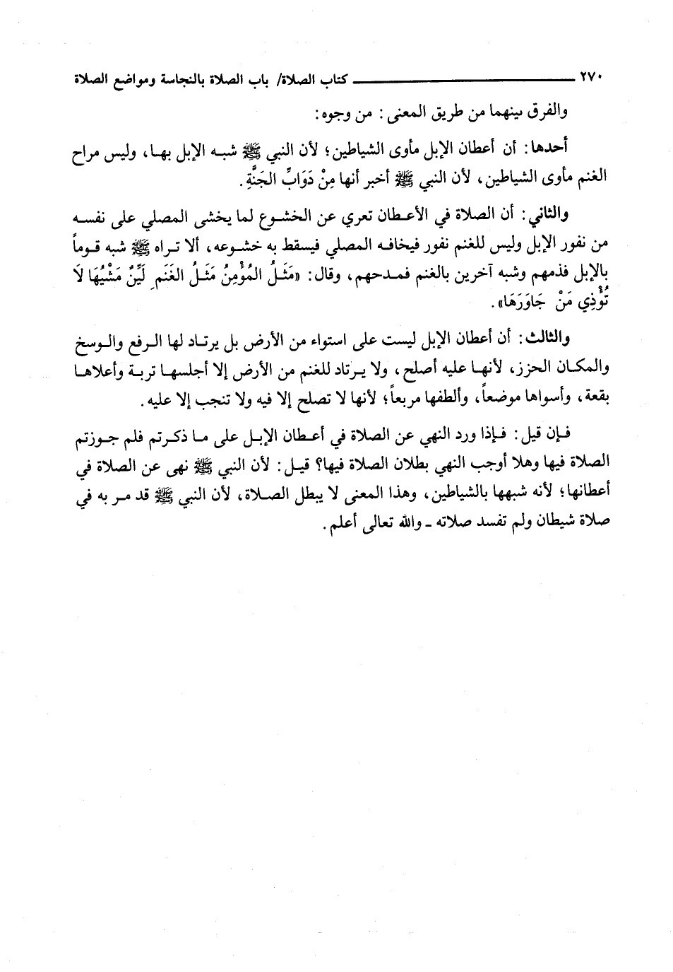 وَالثَّانِي: أَنَّ الصَّلَاةَ فِي الْأَعْطَانِ تُعَرِّي عَنِ الْخُشُوعِ لِمَا يَخْشَى الْمُصَلِّي عَلَى نَفْسِهِ مِنْ نُفُورِ الْإِبِلِ وَلَيْسَ للغنم نفور فيخافه المصلي فيسقط به خشوعه، ألا تراه - صَلَّى اللَّهُ عَلَيْهِ وَسَلَّم َ - شَبَّهَ قَوْمًا بِالْإِبِلِ فَذَمَّهُمْ وَشَبَّهَ آخَرِينَ بِالْغَنَمِ فَمَدَحَهُمْ، وَقَالَ: " مَثَلُ الْمُؤْمِنِ مَثَلُ الْغَنَمِ لينٌ مَشْيُهَا لَا تُؤْذِي مَنْ جَاوَرَهَا "