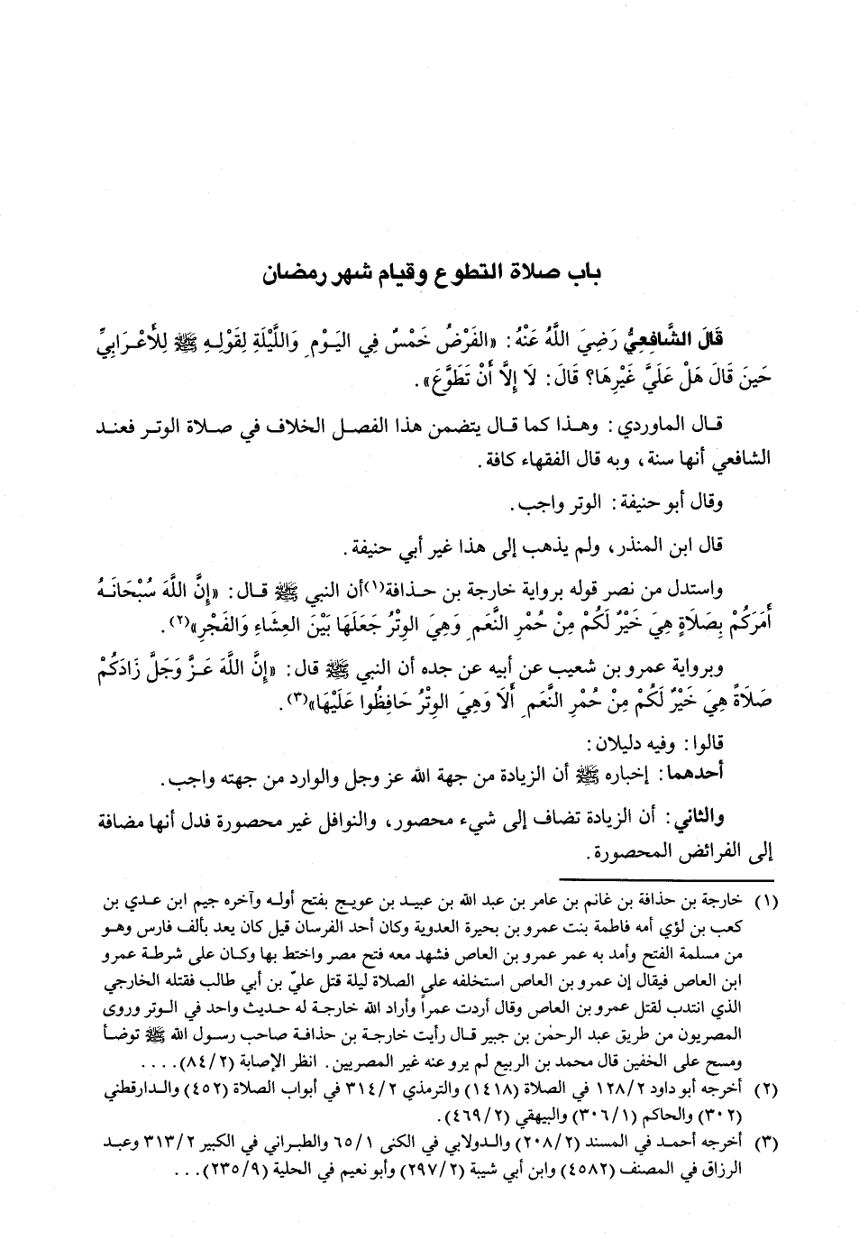 قَالَ الْمَاوَرْدِيُّ: وَهَذَا كَمَا قَالَ يَتَضَمَّنُ هَذَا الْفَصْلُ الْخِلَافَ فِي صَلَاةِ الْوِتْرِ فَعِنْدَ الشَّافِعِيِّ أَنَّهَا سُنَّةٌ، وَبِهِ قَالَ الْفُقَهَاءُ كَافَّةً