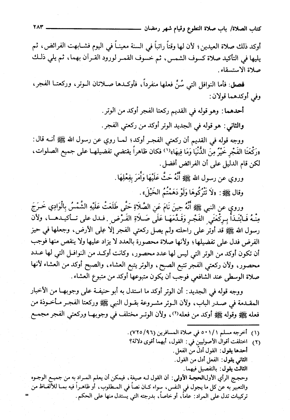 : فَأَمَّا النَّوَافِلُ الَّتِي سُنَّ فِعْلُهَا مُنْفَرِدًا، فَأَوْكَدُهَا صَلَاتَانِ الْوِتْرُ، وَرَكْعَتَا الْفَجْرِ، وَفِي أَوْكَدِهِمَا قَوْلَانِ: