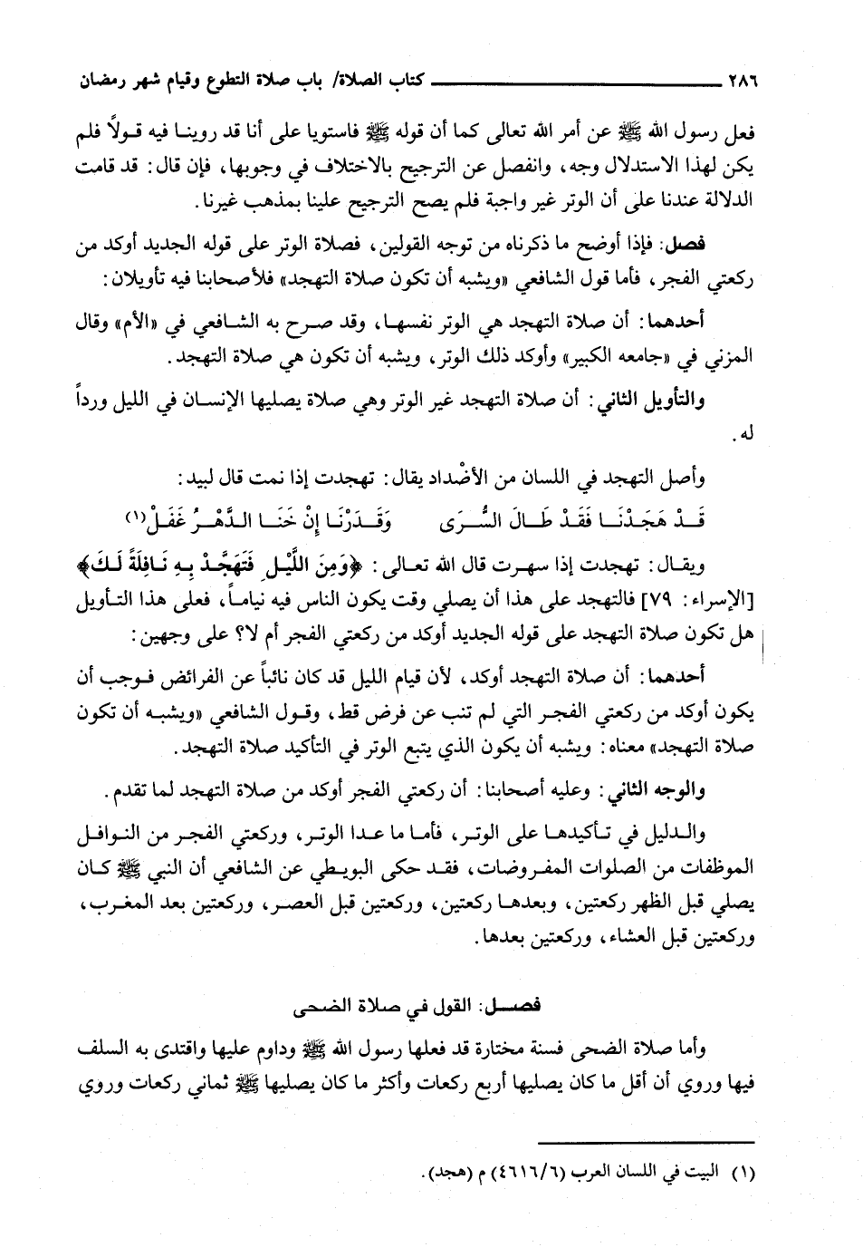 أَحَدُهُمَا: أَنَّ صَلَاةَ التَّهَجُّدِ أَوْكَدُ، لِأَنَّ قِيَامَ اللَّيْلِ قَدْ كَانَ نَائِبًا عَنِ الْفَرَائِضِ فَوَجَبَ أَنْ يَكُونَ أَوْكَدَ مِنْ رَكْعَتَيِ الْفَجْرِ الَّتِي لَمْ تَنُبْ عَنْ فَرْضٍ قَطُّ، وَقَوْلُ الشَّافِعِيِّ " وَيُشْبِهُ أَنْ تَكُونَ صَلَاةُ التَّهَجُّدِ " مَعْنَاهُ: وَيُشْبِهُ أَنْ يَكُونَ الَّذِي يَتْبَعُ الْوِتْرَ فِي التَّأْكِيدِ صَلَاةُ التَّهَجُّدِ