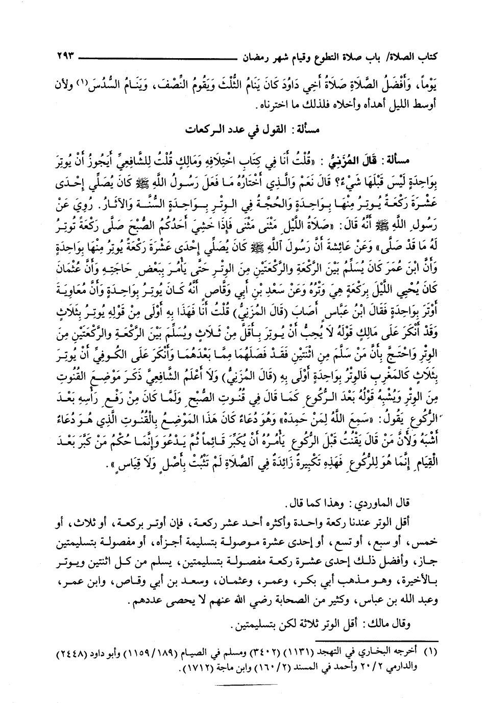 : قَالَ الْمُزَنِيُّ: " قلت أنا في كِتَابِ اخْتِلَافِهِ ومالكٍ قُلْتُ لِلشَّافِعِيِّ أَيَجُوزُ أَنْ يُوتِرَ بواحدةٍ لَيْسَ قَبْلَهَا شَيْءٌ؟ قَالَ نَعَمْ والذي اختاره ما فَعَلَ رَسُولُ اللَّهِ - صَلَّى اللَّهُ عَلَيْهِ وَسَلَّم َ - كان يصلي إحدى عشرة ركعة يوتر منها بواحدةٍ والحجة في الوتر بواحدةٍ السنة والآثار. رُوِيَ عَنْ رَسُولِ اللَّهِ - صَلَّى اللَّهُ عَلَيْهِ وَسَلَّم َ - أنه قَالَ: " صَلَاةُ اللَّيْلِ مَثْنَى مَثْنَى فَإِذَا خَشِيَ أحدكم الصبح صلى ركعة الوتر له ما قد صلى " وعن عَائِشَةَ أَنَّ رَسُولَ اللَّهِ - صَلَّى اللَّهُ عَلَيْهِ وَسَلَّم َ - كان يصلي إحدى عشرة ركعة يوتر منها بواحدةٍ وأن ابن عمر كان يسلم بين الركعة والركعتين من الوتر حتى يأمر ببعض حاجته وأن عثمان كان يحيي الليل بركعةٍ هي وتره وعن سعد بن أبي وقاصٍ أنه كان يوتر بواحدةٍ وأن معاوية أوتر بواحدةٍ فقال ابن عباس أصاب (قال المزني) قلت أنا فهذا به أولى من قوله يوتر بثلاثٍ وقد أنكر على مالكٍ قوله لا يحب أن يوتر بأقل من ثلاثٍ ويسلم بين الركعة والركعتين من الوتر واحتج بأن من سلم من اثنتين فقد فصلهما مما بعدهما وأنكر على الكوفي أن يوتر بثلاث كالمغرب فالوتر بواحدة أولى به (قال المزني) ولا أعلم الشافعي ذكر موضع القنوت من الوتر ويشبه قوله بعد الركوع كما قال في قنوت الصبح ولما كان من رفع رأسه بعد الركوع يقول: " سمع الله لمن حمده " وهو دعاء كان هذا الموضع بالقنوت الذي هو دعاء أشبه ولأن من قال يقنت قبل الركوع يأمره أن يكبر قائماً ثم يدعو وإنما حكم من كبر بعد القيام إنما هو للركوع فهذه تكبيرة زائدة في الصلاة لم تثبت بأصلٍ ولا قياسٍ "
