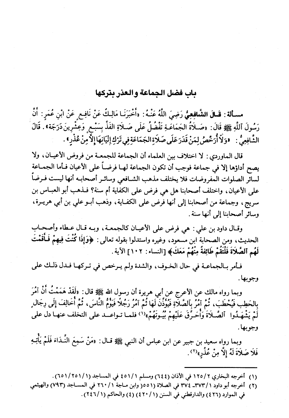 : قَالَ الشافعي رضي الله عنه: " أَخْبَرَنَا مَالِكٌ عَنْ نَافِعٍ عَنِ ابْنِ عُمَرَ: أَنَّ رَسُولَ اللَّهِ - صَلَّى اللَّهُ عَلَيْهِ وَسَلَّم َ - قَالَ: " صَلَاةُ الْجَمَاعَةِ تَفْضُلُ عَلَى صَلَاةِ الْفَذِّ بسبع وعشرين درجة ". قال الشافعي: " ولا أُرخِّصُ لمن قدَر على صلاةِ الجماعةِ في تركِ إتيانها إلا من عُذر "