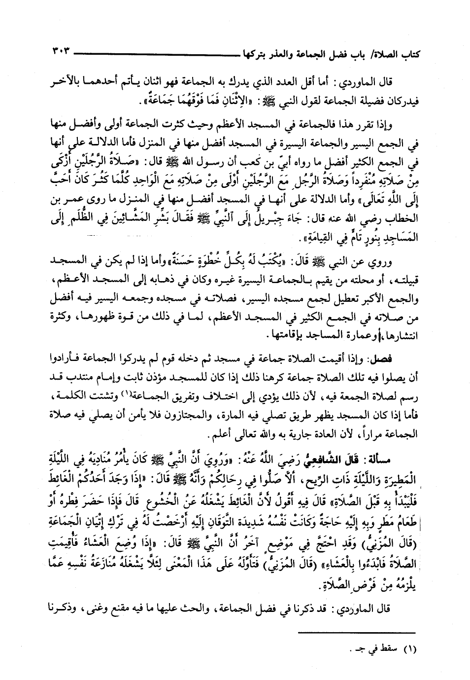 قَالَ الْمَاوَرْدِيُّ: قَدْ ذَكَرْنَا فِي فَضْلِ الْجَمَاعَةِ، وَالْحَثِّ عَلَيْهَا مَا فِيهِ مَقْنَعٌ وغنى، وذكرنا