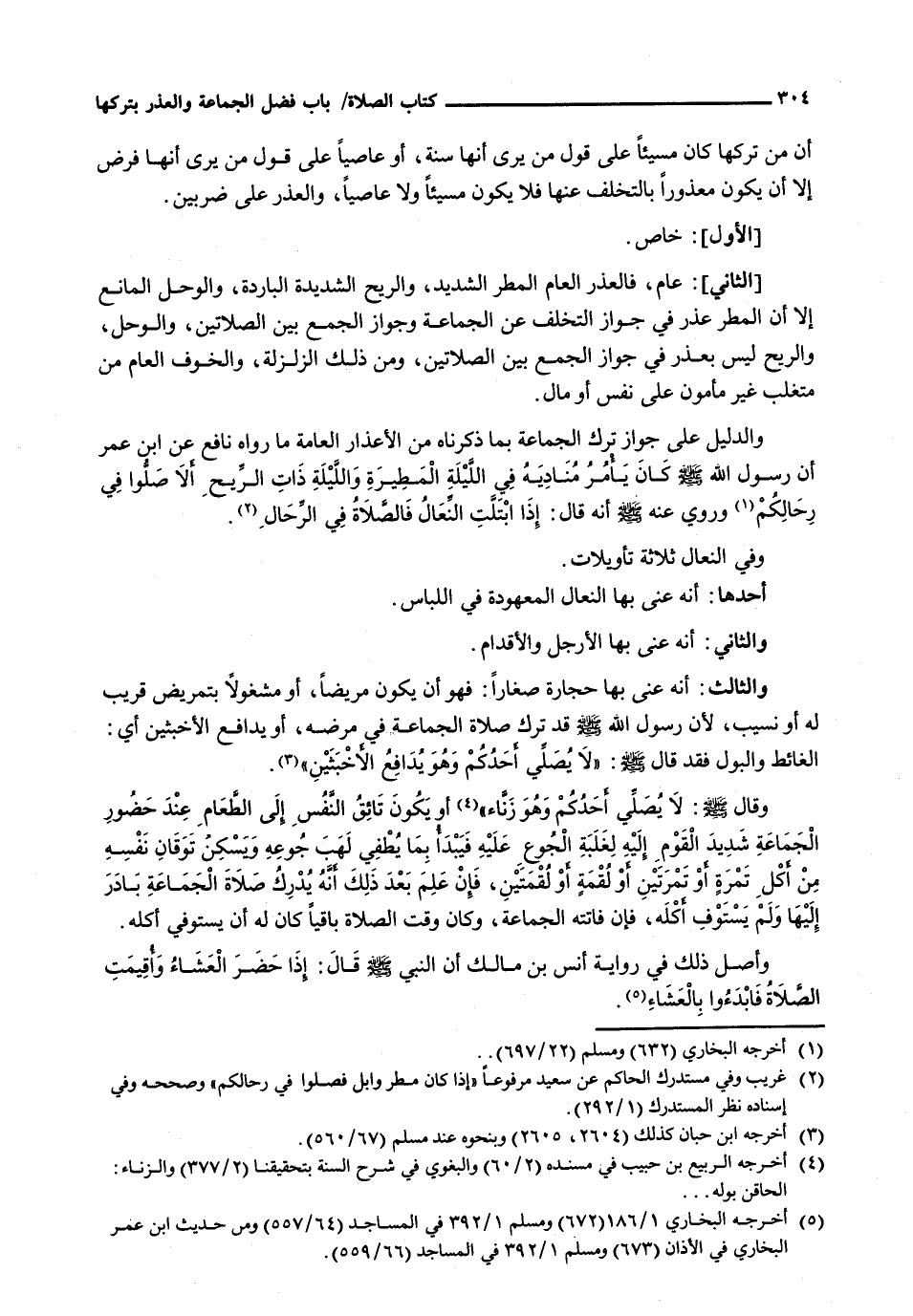 [الثاني] : عَامٌّ، فَالْعُذْرُ الْعَامُّ الْمَطَرُ الشَّدِيدُ، وَالرِّيحُ الشَّدِيدَةُ الْبَارِدَةُ، وَالْوَحْلُ الْمَانِعُ إِلَّا أَنَّ الْمَطَرَ عُذْرٌ فِي جَوَازِ التَّخَلُّفِ عَنِ الْجَمَاعَةِ وَجَوَازِ الْجَمْعِ بين الصلاتين، والوحل، والريح ليس بِعُذْرٍ فِي جَوَازِ الْجَمْعِ بَيْنَ الصَّلَاتَيْنِ، وَمِنْ ذَلِكَ الزَّلْزَلَةُ، وَالْخَوْفُ الْعَامُّ مِنْ مُتَغَلِّبٍ غَيْرِ مَأْمُونٍ عَلَى نَفْسٍ أَوْ مَالٍ