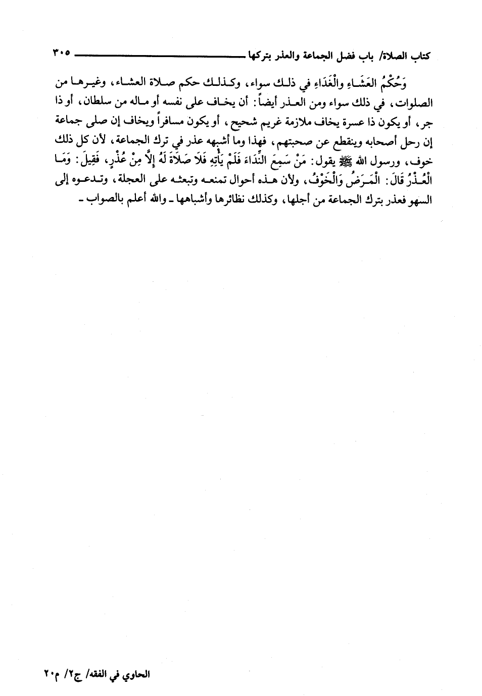 وحكم العشاء والغذاء فَيَ ذَلِكَ سَوَاءٌ، وَكَذَلِكَ حُكْمُ صَلَاةِ الْعِشَاءِ، وَغَيْرِهَا مِنَ الصَّلَوَاتِ، فِي ذَلِكَ سَوَاءٌ وَمِنَ الْعُذْرِ أَيْضًا: أَنْ يَخَافَ عَلَى نَفْسِهِ أَوْ ماله من سلطان، أو ذا جر، أَوْ يَكُونَ ذَا عُسْرَةٍ يَخَافُ مُلَازَمَةَ غَرِيمٍ شَحِيحٍ، أَوْ يَكُونَ مُسَافِرًا وَيَخَافُ إِنْ صَلَّى جماعة إن رحل أَصْحَابُهُ وَيَنْقَطِعَ عَنْ صُحْبَتِهِمْ، فَهَذَا وَمَا أَشْبَهَهُ عُذْرٌ فِي تَرْكِ الْجَمَاعَةِ، لِأَنَّ كُلَّ ذَلِكَ خَوْفٌ، وَرَسُولُ اللَّهِ - صَلَّى اللَّهُ عَلَيْهِ وَسَلَّم َ - يَقُولُ: مَنْ سَمِعَ النِّدَاءَ فَلَمْ يأتِهِ فَلَا صَلَاةَ لَهُ إِلَّا مِنْ عُذْرٍ، فَقِيلَ: وَمَا الْعُذْرُ قَالَ: الْمَرَضُ وَالْخَوْفُ، وَلِأَنَّ هَذِهِ أَحْوَالٌ تَمْنَعُهُ وَتَبْعَثُهُ عَلَى الْعَجَلَةِ، وَتَدْعُوهُ إِلَى السَّهْوِ فَعُذِرَ بِتَرْكِ الْجَمَاعَةِ مِنْ أَجْلِهَا، وَكَذَلِكَ نَظَائِرُهَا وَأَشْبَاهُهَا - وَاللَّهُ أَعْلَمُ بِالصَّوَابِ -