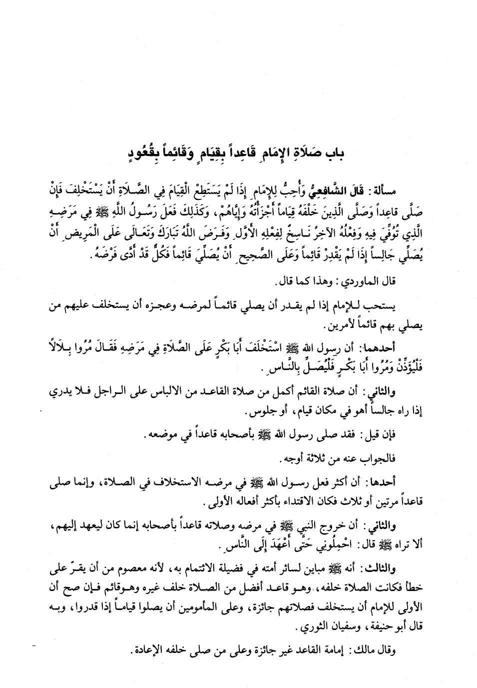وَالثَّالِثُ: أنه - صَلَّى اللَّهُ عَلَيْهِ وَسَلَّم َ - مُبَايِنٌ لِسَائِرِ أُمَّتِهِ فِي فَضِيلَةِ الِائْتِمَامِ بِهِ، لِأَنَّهُ مَعْصُومٌ مِنْ أَنْ يُقِرَّ عَلَى خَطَأٍ فَكَانَتِ الصَّلَاةُ خَلْفَهُ، وَهُوَ قَاعِدٌ أَفْضَلَ مِنَ الصَّلَاةِ خَلْفَ غَيْرِهِ وَهُوَ قَائِمٌ فَإِنْ صَحَّ أَنَّ الْأَوْلَى لِلْإِمَامِ أَنْ يَسْتَخْلِفَ فَصَلَاتُهُمْ جَائِزَةٌ، وَعَلَى الْمَأْمُومِينَ أَنْ يُصَلُّوا قِيَامًا إِذَا قَدَرُوا، وَبِهِ قَالَ أبو حنيفة، وَسُفْيَانُ الثَّوْرِيُّ