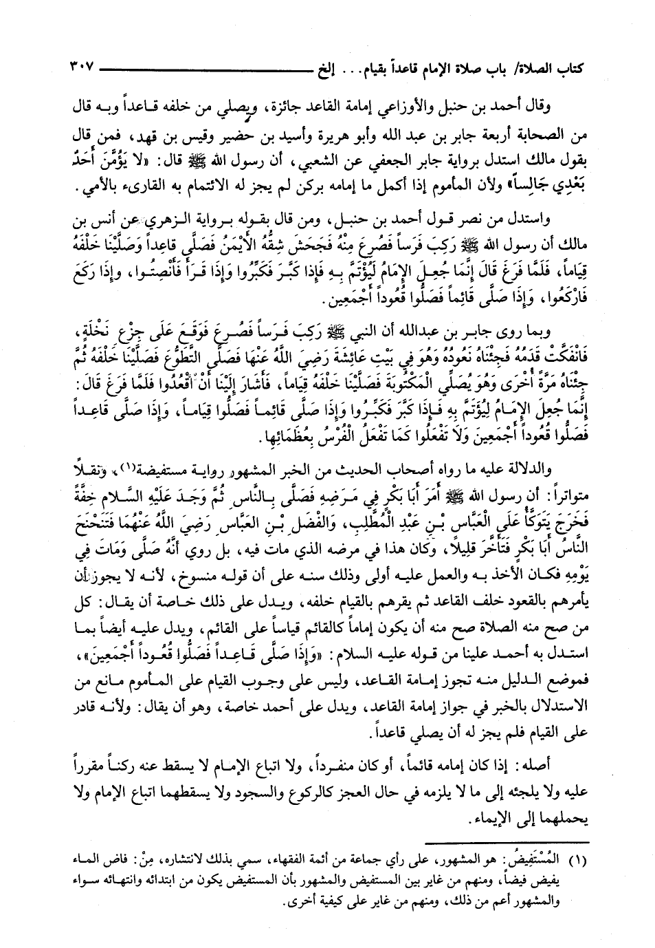 وَبِمَا رَوَى جَابِرُ بْنُ عَبْدِ اللَّهِ أَنَّ النَّبِيَّ - صَلَّى اللَّهُ عَلَيْهِ وَسَلَّم َ - ركب فرساً فصرع فوقع على جِزع نَخْلَةٍ، فَانْفَكَّتْ قَدَمُهُ فَجِئْنَاهُ نعودُه وَهُوَ فِي بَيْتِ عَائِشَةَ رَضِيَ اللَّهُ عَنْهَا فَصَلَّى التَّطَوُّعَ فَصَلَّيْنَا خَلْفَهُ ثُمَّ جِئْنَاهُ مَرَّةً أُخْرَى وَهُوَ يُصَلِّي الْمَكْتُوبَةَ فَصَلَّيْنَا خَلْفَهُ قِيَامًا، فَأَشَارَ إِلَيْنَا أَنِ اقْعُدُوا فَلَمَّا فَرَغَ قَالَ: إِنَّمَا جُعِلَ الْإِمَامُ لِيُؤْتَمَّ بِهِ فَإِذَا كَبَّرَ فَكَبِّرُوا وَإِذَا صَلَّى قَائِمًا فَصَلُّوا قِيَامًا، وَإِذَا صَلَّى قَاعِدًا فَصَلُّوا قُعُودًا أَجْمَعِينَ وَلَا تَفْعَلُوا كَمَا تَفْعَلُ الفُرس بعُظمائها