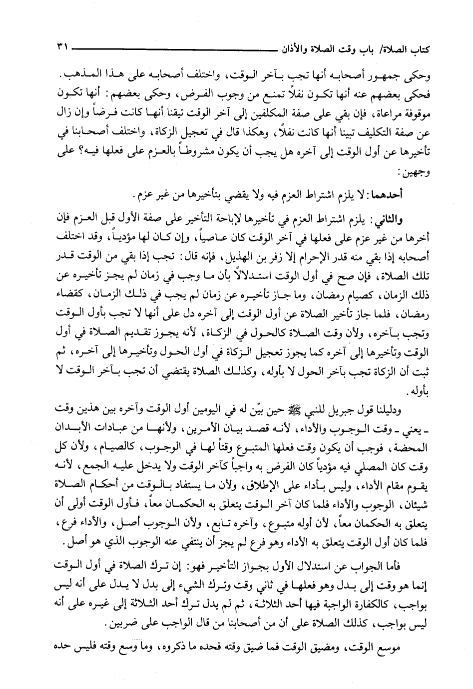 وَالثَّانِي: يَلْزَمُ اشْتِرَاطُ الْعَزْمِ فِي تَأْخِيرِهَا لِإِبَاحَةِ التَّأْخِيرِ عَلَى صِفَةِ الْأَوَّلِ قَبْلَ الْعَزْمِ فَإِنْ أَخَّرَهَا مِنْ غَيْرِ عَزْمٍ عَلَى فِعْلِهَا فِي آخِرِ الْوَقْتِ كَانَ عَاصِيًا، وَإِنْ كَانَ لَهَا مُؤَدِّيًا، وَقَدِ اخْتَلَفَ أَصْحَابُهُ إِذَا بَقِيَ مِنْهُ قَدْرُ الْإِحْرَامِ إِلَّا زفر بن الهذيل، فَإِنَّهُ قَالَ: تَجِبُ إِذَا بَقِيَ مِنَ الْوَقْتِ قَدْرَ تِلْكَ الصَّلَاةِ، فَإِنْ صَحَّ فِي أَوَّلِ الْوَقْتِ اسْتِدْلَالًا بِأَنَّ مَا وَجَبَ فِي زَمَانٍ لَمْ يَجُزْ تَأْخِيرُهُ عَنْ ذَلِكَ الزَّمَانِ، كَصِيَامِ رَمَضَانَ، وَمَا جَازَ تَأْخِيرُهُ عَنْ زَمَانٍ لَمْ يَجِبْ فِي ذَلِكَ الزَّمَانِ، كَقَضَاءِ رَمَضَانَ، فَلَمَّا جَازَ تَأْخِيرُ الصَّلَاةِ عَنْ أَوَّلِ الْوَقْتِ إِلَى آخِرِهِ دَلَّ عَلَى أَنَّهَا لَا تَجِبُ بِأَوَّلِ الْوَقْتِ وَتَجِبُ بِآخِرِهِ، وَلِأَنَّ وَقْتَ الصَّلَاةِ كَالْحَوْلِ فِي الزَّكَاةِ، لِأَنَّهُ يَجُوزُ تَقْدِيمُ الصَّلَاةِ فِي أَوَّلِ الْوَقْتِ وَتَأْخِيرُهَا إِلَى آخِرِهِ كَمَا يَجُوزُ تَعْجِيلُ الزَّكَاةِ فِي أَوَّلِ الْحَوْلِ وَتَأْخِيرُهَا إِلَى آخِرِهِ، ثُمَّ ثَبَتَ أَنَّ الزَّكَاةَ تَجِبُ بِآخِرِ الْحَوْلِ لَا بِأَوَّلِهِ، وَكَذَلِكَ الصَّلَاةُ يَقْتَضِي أَنْ تَجِبَ بِآخِرِ الْوَقْتِ لَا بِأَوَّلِهِ.
