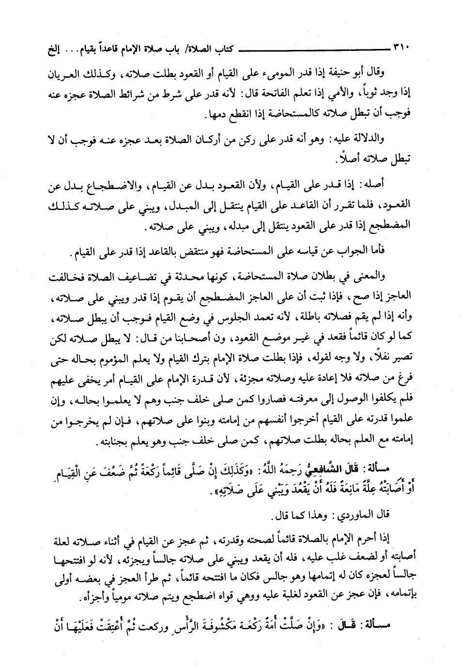 وَالْمَعْنَى فِي بُطْلَانِ صَلَاةِ الْمُسْتَحَاضَةِ، كَوْنُهَا مُحْدِثَةً فِي تَضَاعِيفِ الصَّلَاةِ فَخَالَفَتِ الْعَاجِزَ إِذَا صَحَّ، فَإِذَا ثَبَتَ أَنَّ عَلَى الْعَاجِزِ الْمُضْطَجِعِ أَنْ يَقُومَ إِذَا قَدَرَ وَيَبْنِيَ عَلَى صَلَاتِهِ، وَأَنَّهُ إِذَا لَمْ يَقُمْ فَصَلَاتُهُ بَاطِلَةٌ، لِأَنَّهُ تَعَمَّدَ الْجُلُوسَ فِي وضع الْقِيَامِ فَوَجَبَ أَنْ يُبْطِلَ صَلَاتَهُ، كَمَا لَوْ كَانَ قَائِمًا فَقَعَدَ فِي غَيْرِ مَوْضِعِ الْقُعُودِ، وَمِنْ أَصْحَابِنَا مَنْ قَالَ: لَا يُبْطِلُ صَلَاتَهُ لَكِنْ تَصِيرُ نَفْلًا، وَلَا وَجْهَ لِقَوْلِهِ، فَإِذَا بطلت صلاة الإمام بترك القيام ولا يعلم المؤموم بِحَالِهِ حَتَّى فَرَغَ مِنْ صَلَاتِهِ فَلَا إِعَادَةَ عَلَيْهِ وَصَلَاتُهُ مُجْزِئَةٌ، لِأَنَّ قُدْرَةَ الْإِمَامِ عَلَى الْقِيَامِ أَمْرٌ يَخْفَى عَلَيْهِمْ فَلَمْ يُكَلَّفُوا الْوُصُولَ إِلَى مَعْرِفَتِهِ فَصَارُوا كَمَنْ صَلَّى خَلْفَ جُنُبٍ وهم لا يعلموا بِحَالِهِ، وَإِنْ عَلِمُوا قُدْرَتَهُ عَلَى الْقِيَامِ أَخْرَجُوا أَنْفُسَهُمْ مِنْ إِمَامَتِهِ وَبَنَوْا عَلَى صَلَاتِهِمْ، فَإِنْ لَمْ يَخْرُجُوا مِنْ إِمَامَتِهِ مَعَ الْعِلْمِ بِحَالِهِ بَطَلَتْ صَلَاتُهُمْ، كَمَنْ صَلَّى خَلْفَ جُنُبٍ وَهُوَ يعلم بجنايته