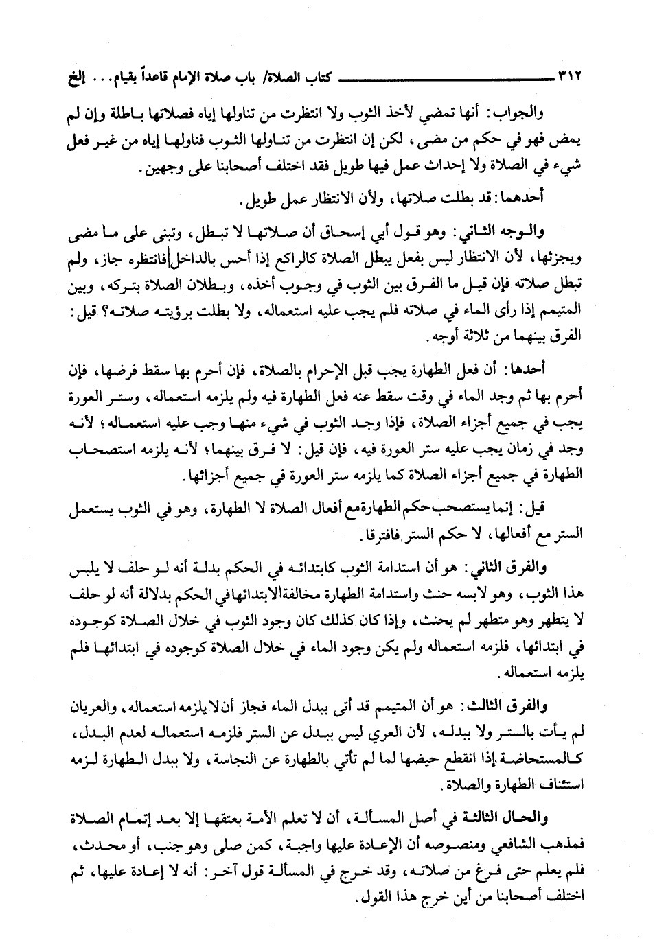 وَالْوَجْهُ الثَّانِي: وَهُوَ قَوْلُ أَبِي إِسْحَاقَ إِنَّ صَلَاتَهَا لَا تَبْطُلُ، وَتَبْنِي عَلَى مَا مَضَى وَيُجْزِئُهَا، لِأَنَّ الِانْتِظَارَ لَيْسَ بفعل يبطل الصلاة كالراكع إِذَا أَحَسَّ بِالدَّاخِلِ فَانْتَظَرَهُ جَازَ، وَلَمْ تَبْطُلْ صَلَاتُهُ فَإِنْ قِيلَ مَا الْفَرْقُ بَيْنَ الثَّوْبِ فِي وُجُوبِ أَخْذِهِ، وَبُطْلَانِ الصَّلَاةِ بِتَرْكِهِ، وَبَيْنَ الْمُتَيَمِّمِ إِذَا رَأَى الْمَاءَ فِي صَلَاتِهِ فَلَمْ يَجِبْ عَلَيْهِ اسْتِعْمَالُهُ، وَلَا بَطَلَتْ بِرُؤْيَتِهِ صَلَاتُهُ؟ قِيلَ: الْفَرْقُ بَيْنَهُمَا مِنْ ثَلَاثَةِ أَوْجُهٍ