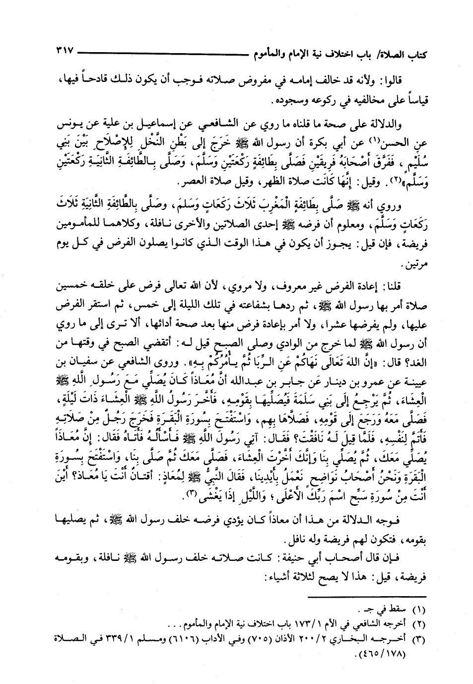 وَالدَّلَالَةُ عَلَى صِحَّةِ مَا قُلْنَاهُ مَا رُوِيَ عَنِ الشَّافِعِيِّ عَنْ إِسْمَاعِيلَ بْنِ عُلَيَّةَ عَنْ يُونُسَ عَنِ الْحَسَنِ عَنْ أَبِي بَكْرَةَ أَنَّ رَسُولَ اللَّهِ - صَلَّى اللَّهُ عَلَيْهِ وَسَلَّم َ - خَرَجَ إِلَى بَطْنِ النَّخْلِ لِلْإِصْلَاحِ بَيْنَ بَنِي سُلَيْمٍ، فَفَرَّقَ أَصْحَابَهُ فَرِيقَيْنِ فَصَلَّى بِطَائِفَةٍ رَكْعَتَيْنِ وَسَلَّمَ، وَصَلَّى بِالطَّائِفَةِ الثَّانِيَةِ رَكْعَتَيْنِ وَسَلَّمَ ". وَقِيلَ: إِنَّهَا كَانَتْ صَلَاةَ الظُّهْرِ، وَقِيلَ صَلَاةُ الْعَصْرِ