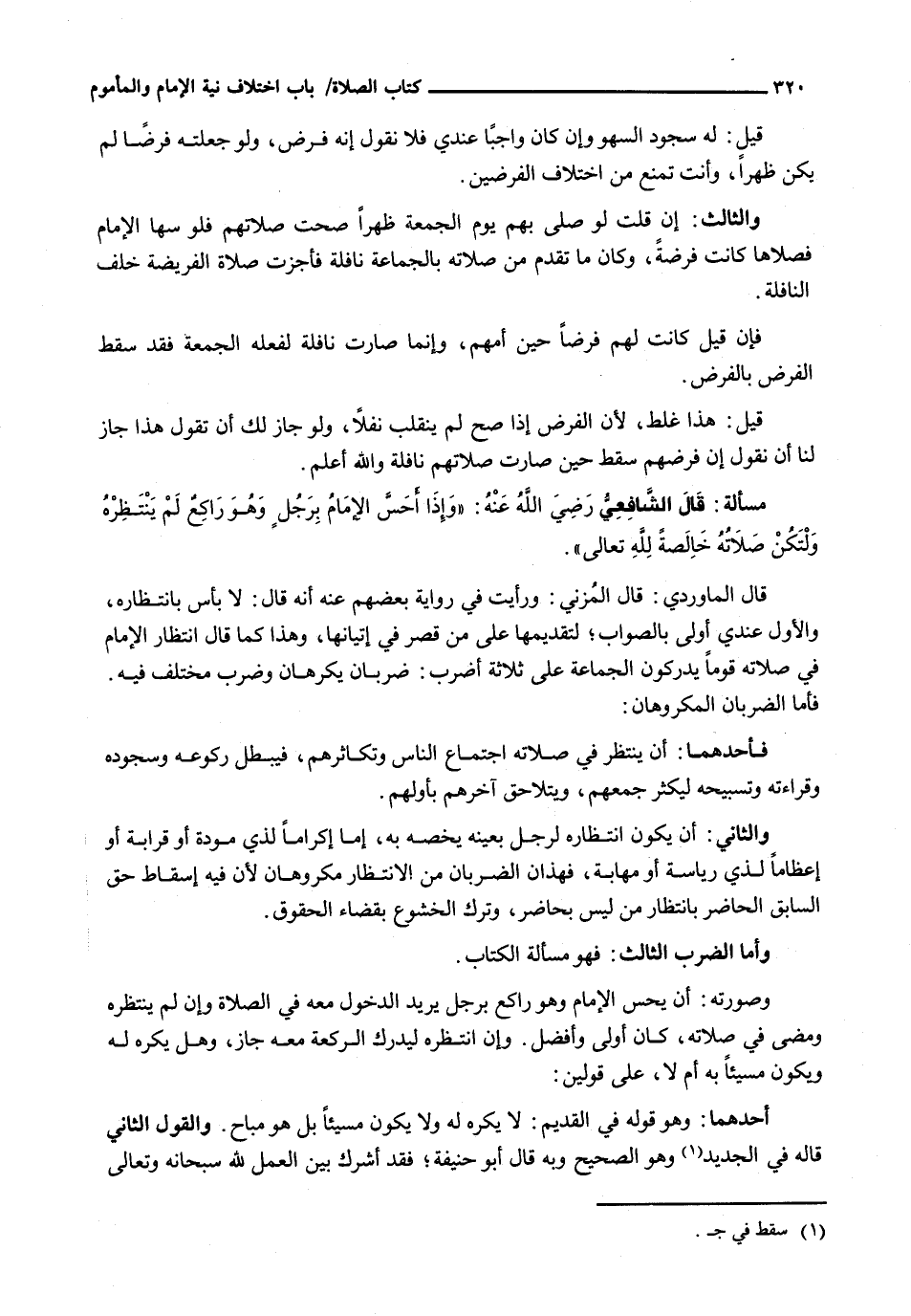 قَالَ الْمَاوَرْدِيُّ: قَالَ المُزني: وَرَأَيْتُ فِي رِوَايَةِ بَعْضِهِمْ عَنْهُ أَنَّهُ قَالَ: لَا بَأْسَ بِانْتِظَارِهِ، وَالْأَوَّلُ عِنْدِي أَوْلَى بِالصَّوَابِ؛ لِتَقْدِيمِهَا عَلَى مَنْ قَصَّرَ فِي إِتْيَانِهَا، وَهَذَا كَمَا قَالَ انْتِظَارُ الْإِمَامِ فِي صَلَاتِهِ قَوْمًا يُدْرِكُونَ الْجَمَاعَةَ عَلَى ثَلَاثَةِ أَضْرُبٍ: ضَرْبَانِ يُكْرَهَانِ وَضَرْبٌ مُخْتَلَفٌ فِيهِ فَأَمَّا الضَّرْبَانِ الْمَكْرُوهَانِ: