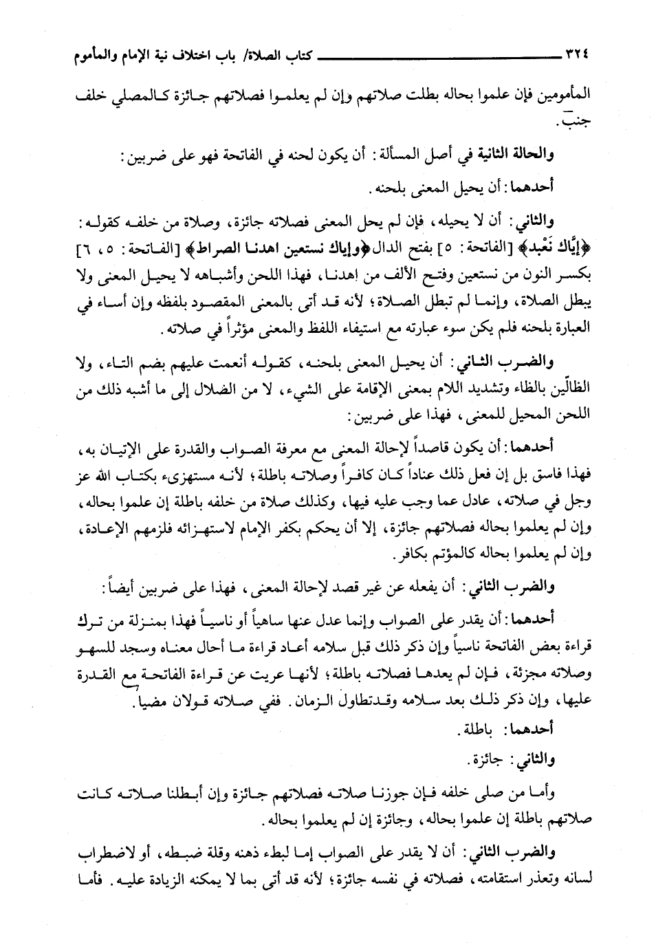وَالثَّانِي: أَنْ لَا يُحِيلَهُ، فَإِنْ لَمْ يُحِلِ الْمَعْنَى فَصَلَاتُهُ جَائِزَةٌ، وَصَلَاةُ مَنْ خَلْفَهُ كَقَوْلِهِ: {إِيَّاكَ نَعْبُدُ} [الفاتحة: 5] بفتح الدال {وإياك نستعين اهْدِنَا الصِّرَاطَ} [الفاتحة: 5، 6] بِكَسْرِ النُّونِ مِنْ نَسْتَعِينُ وَفَتْحِ الْأَلِفِ مِنَ اهْدِنَا، فَهَذَا اللَّحْنُ وَأَشْبَاهُهُ لَا يُحِيلُ الْمَعْنَى وَلَا يُبْطِلُ الصَّلَاةَ، وَإِنَّمَا لَمْ تَبْطُلِ الصَّلَاةُ؛ لِأَنَّهُ قَدْ أَتَى بِالْمَعْنَى الْمَقْصُودِ بِلَفْظِهِ وَإِنْ أَسَاءَ فِي الْعِبَارَةِ بِلَحْنِهِ فَلَمْ يَكُنْ سُوءُ عِبَارَتِهِ مَعَ اسْتِيفَاءِ اللَّفْظِ وَالْمَعْنَى مُؤَثِّرًا فِي صَلَاتِهِ