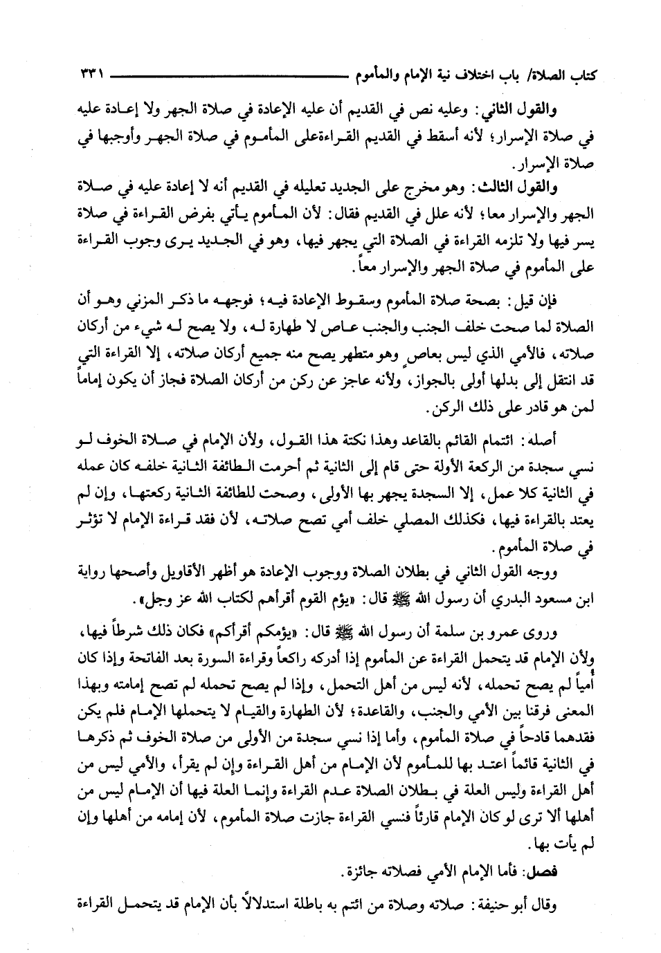 وَرَوَى عَمْرُو بْنُ سَلَمَةَ أَنَّ رَسُولَ اللَّهِ - صَلَّى اللَّهُ عَلَيْهِ وَسَلَّم َ - قال: " يؤمكم أقرأكم " فَكَانَ ذَلِكَ شَرْطًا فِيهَا، وَلِأَنَّ الْإِمَامَ قَدْ يَتَحَمَّلُ الْقِرَاءَةَ عَنِ الْمَأْمُومِ إِذَا أَدْرَكَهُ رَاكِعًا وقراءة السُّورَةَ بَعْدَ الْفَاتِحَةِ وَإِذَا كَانَ أُمِّيًّا لَمْ يَصِحَّ تَحَمُّلُهُ، لِأَنَّهُ لَيْسَ مِنْ أَهْلِ التَّحَمُّلِ، وَإِذَا لَمْ يَصِحَّ تَحَمُّلُهُ لَمْ تَصِحَّ إِمَامَتُهُ وبهذا المعنى فرقنا بين الأمي والجنب، والقاعدة؛ لِأَنَّ الطَّهَارَةَ وَالْقِيَامَ لَا يَتَحَمَّلُهَا الْإِمَامُ فَلَمْ يَكُنْ فَقْدُهُمَا قَادِحًا فِي صَلَاةِ الْمَأْمُومِ، وَأَمَّا إِذَا نَسِيَ سَجْدَةً مِنَ الْأُولَى مِنْ صَلَاةِ الخوف ثُمَّ ذَكَرَهَا فِي الثَّانِيَةِ قَائِمًا اعْتَدَّ بِهَا للمأموم لِأَنَّ الْإِمَامَ مِنْ أَهْلِ الْقِرَاءَةِ وَإِنْ لَمْ يَقْرَأْ، وَالْأُمِّيُّ لَيْسَ مِنْ أَهْلِ الْقِرَاءَةِ وَلَيْسَ الْعِلَّةُ فِي بُطْلَانِ الصَّلَاةِ عَدَمُ الْقِرَاءَةِ وَإِنَّمَا الْعِلَّةُ فِيهَا أَنَّ الْإِمَامَ لَيْسَ مِنْ أَهْلِهَا أَلَا تَرَى لَوْ كَانَ الْإِمَامُ قَارِئًا فَنَسِيَ الْقِرَاءَةَ جَازَتْ صَلَاةُ الْمَأْمُومِ، لِأَنَّ إِمَامَهُ مِنْ أَهْلِهَا وَإِنْ لَمْ يَأْتِ بِهَا