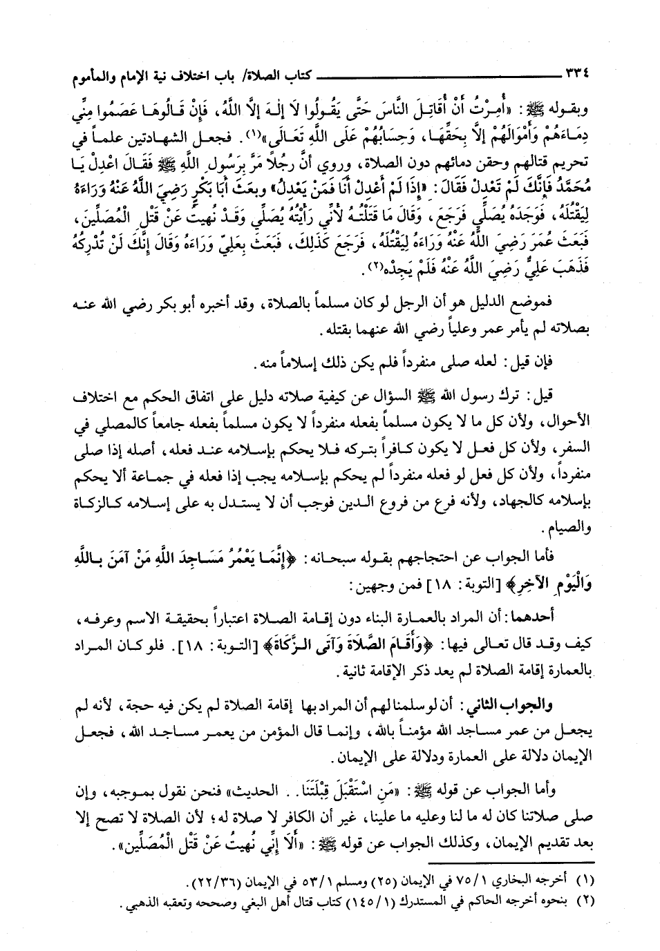 وَأَمَّا الْجَوَابُ عَنْ قَوْلِهِ - صَلَّى اللَّهُ عَلَيْهِ وَسَلَّم َ -: " من استقبل قبلتنا. . الحديث " فَنَحْنُ نَقُولُ بِمُوجَبِهِ، وَإِنْ صَلَّى صَلَاتَنَا كَانَ لَهُ مَا لَنَا وَعَلَيْهِ مَا عَلَيْنَا، غَيْرَ أَنَّ الْكَافِرَ لَا صَلَاةَ لَهُ؛ لِأَنَّ الصَّلَاةَ لا تصح إلا بعد تقديم الْإِيمَانِ، وَكَذَلِكَ الْجَوَابُ عَنْ قَوْلِهِ - صَلَّى اللَّهُ عَلَيْهِ وَسَلَّم َ -: " أَلَا إِنِّي نُهِيتُ عَنْ قَتْلِ الْمُصَلِّينَ "