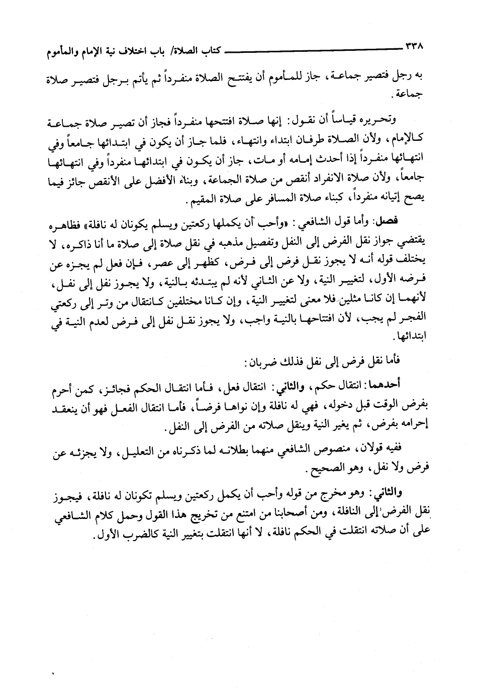 : وَأَمَّا قَوْلُ الشَّافِعِيِّ: " وَأُحِبُّ أَنْ يُكْمِلَهَا رَكْعَتَيْنِ وَيُسَلِّمَ يَكُونَانِ لَهُ نَافِلَةً " فَظَاهِرُهُ يَقْتَضِي جَوَازَ نَقْلِ الْفَرْضِ إِلَى النَّفْلِ وَتَفْصِيلُ مَذْهَبِهِ فِي نَقْلِ صَلَاةٍ إِلَى صَلَاةٍ مَا أَنَا ذَاكِرُهُ، لَا يَخْتَلِفُ قَوْلُهُ إِنَّهُ لَا يَجُوزُ نَقْلُ فَرْضٍ إِلَى فَرْضٍ، كَظُهْرٍ إِلَى عَصْرٍ، فَإِنْ فَعَلَ لَمْ يُجْزِهِ عَنْ فَرْضِهِ الْأَوَّلِ، لِتَغْيِيرِ النِّيَّةِ، وَلَا عَنِ الثَّانِي لِأَنَّهُ لَمْ يَبْتَدِئْهُ بِالنِّيَّةِ، وَلَا يَجُوزُ نَفْلٌ إِلَى نَفْلٍ، لِأَنَّهُمَا إِنْ كَانَا مِثْلَيْنِ فَلَا مَعْنَى لِتَغْيِيرِ النِّيَّةِ، وَإِنْ كَانَا مُخْتَلِفَيْنِ كَانْتِقَالٍ مِنْ وِتْرٍ إِلَى رَكْعَتَيِ الْفَجْرِ لم يجب، لأن افتتاحها بِالنِّيَّةِ وَاجِبٌ، وَلَا يَجُوزُ نَقْلُ نَفْلٍ إِلَى فَرْضٍ لِعَدَمِ النِّيَّةِ فِي ابْتِدَائِهَا