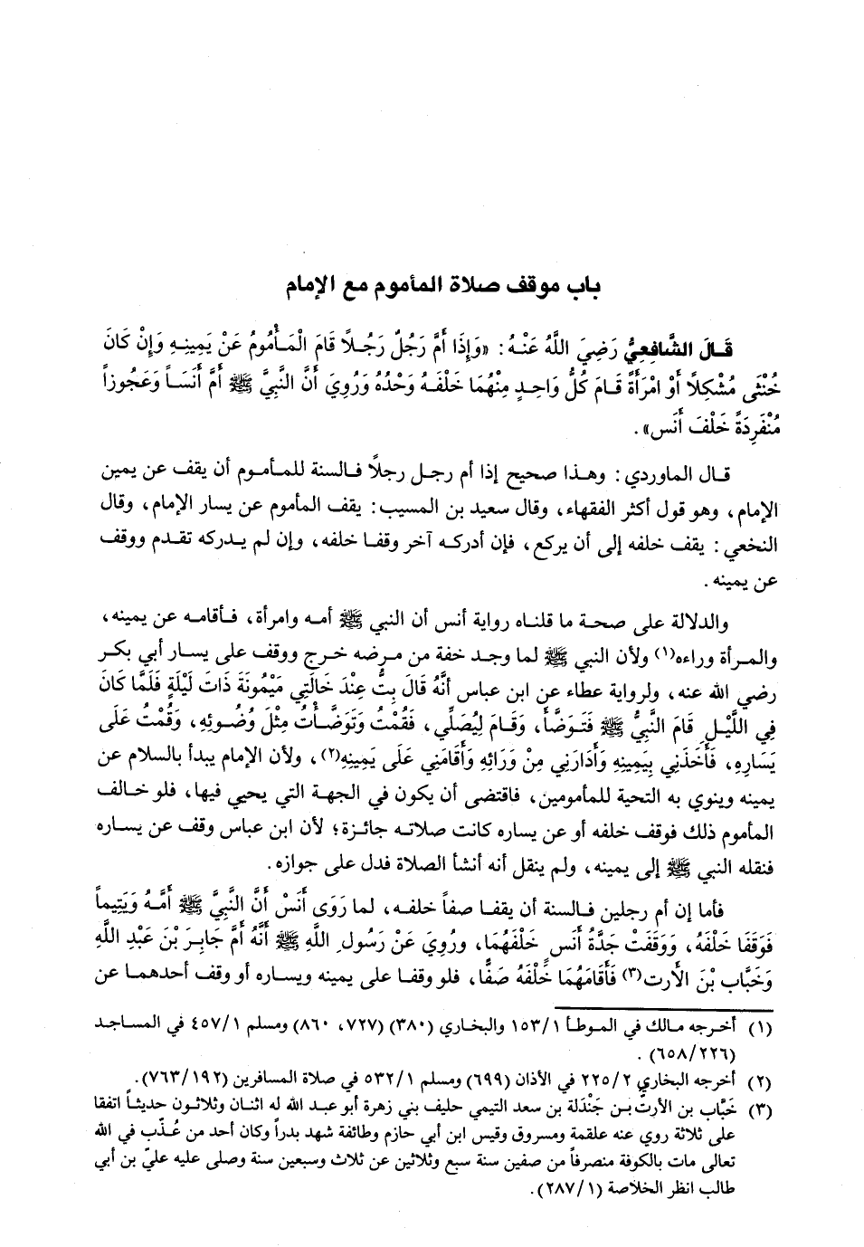 قال الشافعي رضي الله عنه: " وَإِذَا أَمَّ رَجُلٌ رَجُلًا قَامَ الْمَأْمُومُ عَنْ يَمِينِهِ وَإِنْ كَانَ خُنْثَى مُشْكِلًا أَوِ امْرَأَةً قَامَ كُلُّ واحدٍ مِنْهُمَا خَلْفَهُ وَحْدَهُ وَرُوِيَ أَنَّ النَّبِيَّ - صَلَّى اللَّهُ عَلَيْهِ وَسَلَّم َ - أَمَّ أَنَسًا وَعَجُوزًا مُنْفَرِدَةً خَلْفَ أَنَسٍ "