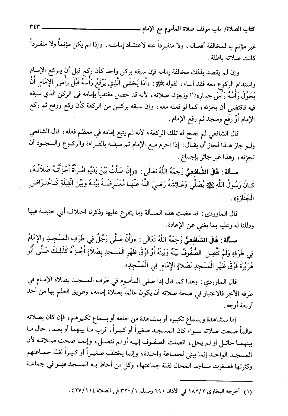 إما بمشاهدة وبسماع تَكْبِيرِهِ أَوْ بِمُشَاهَدَةِ مَنْ خَلْفَهُ أَوْ بِسَمَاعِ تَكْبِيرِهِمْ، فَإِنْ كَانَ بِصَلَاتِهِ عَالِمًا صَحَّتْ صَلَاتُهُ سَوَاءٌ كَانَ الْمَسْجِدُ صَغِيرًا أَوْ كَبِيرًا، قَرُبَ مَا بَيْنَهُمَا أَوْ بَعُدَ، حَالَ مَا بَيْنَهُمَا حَائِلٌ أَوْ لَمْ يَحُلْ، اتَّصَلَتِ الصُّفُوفُ إِلَيْهِ أَوْ لَمْ تَتَّصِلْ، وَإِنَّمَا صَحَّتْ صَلَاتُهُ لِأَنَّ الْمَسْجِدَ الْوَاحِدَ إِنَّمَا يُبْنَى لِجَمَاعَةٍ وَاحِدَةٍ؛ وَإِنَّمَا يَخْتَلِفُ صَغِيرًا أَوْ كَبِيرًا لِقِلَّةِ جَمَاعَتِهِمْ وَكَثْرَتِهَا فَصَغُرَتْ مَسَاجِدُ الْمَحَالِّ لِقِلَّةِ جَمَاعَتِهَا، وَكُلُّ مَنْ أَحَاطَ بِهِ الْمَسْجِدُ فَهُوَ فِي جَمَاعَةٍ