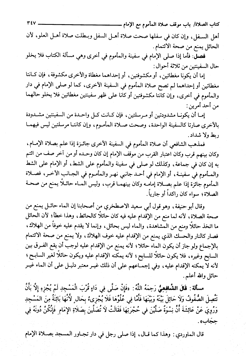 فَمَذْهَبُ الشَّافِعِيِّ أَنَّ صَلَاةَ الْمَأْمُومِ فِي السَّفِينَةِ الْأُخْرَى جَائِزَةٌ إِذَا عَلِمَ بِصَلَاةِ الْإِمَامِ، وَكَانَ بَيْنَهُمْ قُرْبٌ وَكَانَ اعْتِبَارُ الْقُرْبِ مِنْ مَوْقِفِ الْإِمَامِ إِنْ كَانَ وَحْدَهُ أَوْ مِنْ آخَرِ صَفٍّ مَنِ ائْتَمَّ بِهِ إِنْ كَانَ فِي جَمَاعَةٍ، وَكَذَلِكَ لَوْ صَلَّى فِي سَفِينَةٍ وَالْمَأْمُومُ عَلَى الشَّطِّ، أَوِ الْإِمَامُ عَلَى الشَّطِّ وَالْمَأْمُومُ فِي سَفِينَةٍ، أَوِ الْإِمَامُ فِي أَحَدِ جَانِبَيْ نَهْرٍ وَالْمَأْمُومُ فِي الْجَانِبِ الْآخَرِ، فَصَلَاةُ الْمَأْمُومِ جَائِزَةٌ إِذَا عَلِمَ بِصَلَاةِ إِمَامِهِ وَكَانَ بَيْنَهُمَا قُرْبٌ، وَلَيْسَ الْمَاءُ حَائِلًا يَمْنَعُ مِنْ صِحَّةِ الصَّلَاةِ؛ سَوَاءٌ كَانَ رَاكِدًا أَوْ جَارِيًا