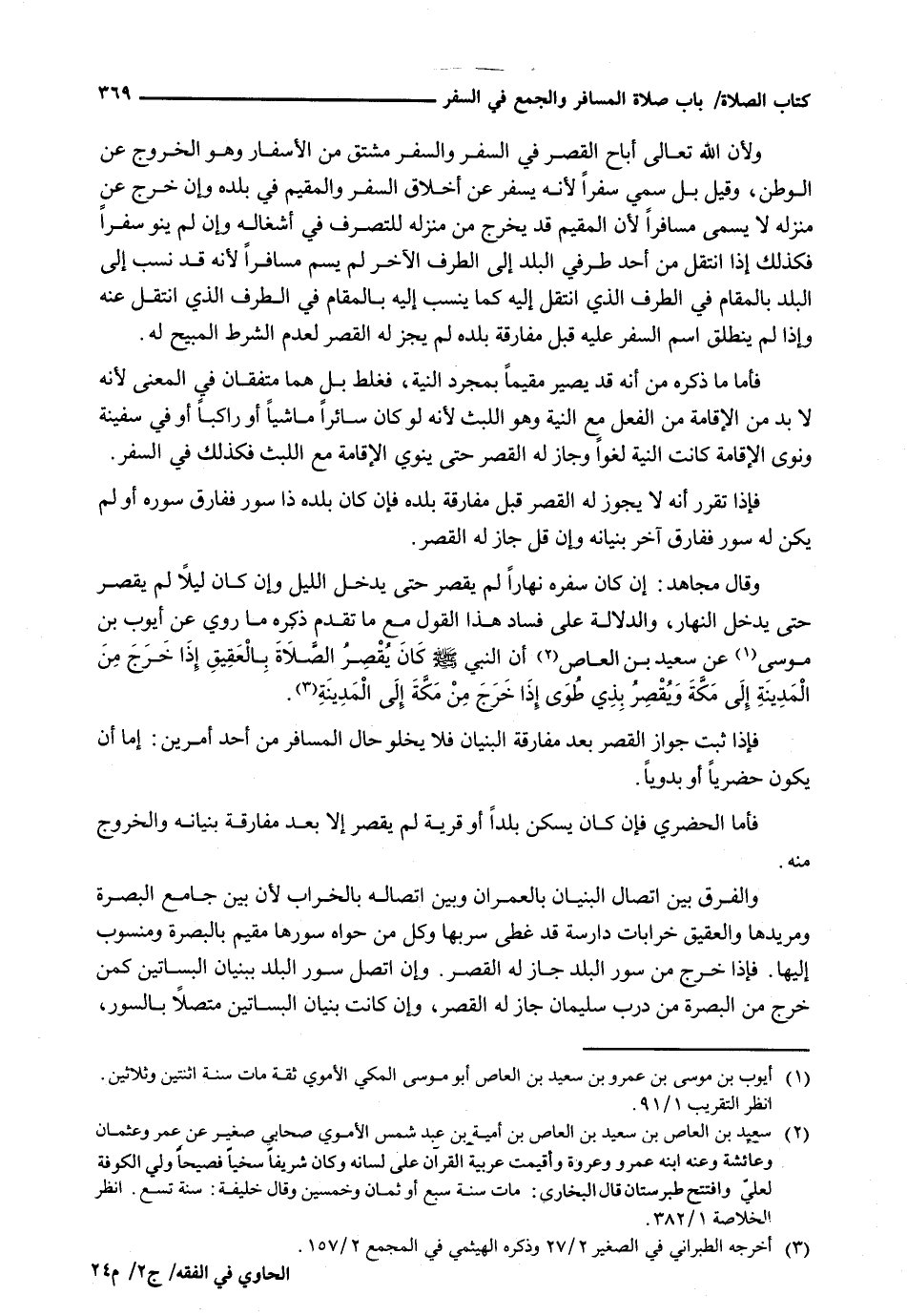 وَالْفَرْقُ بَيْنَ اتِّصَالِ الْبُنْيَانِ بِالْعُمْرَانِ وَبَيْنَ اتِّصَالِهِ بِالْخَرَابِ لِأَنَّ بَيْنَ جَامِعِ البصرة ومريدها وَالْعَقِيقِ خَرَابَاتٍ دَارِسَةً قَدْ غَطَّى سِرْبَهَا وَكُلَّ مَنْ حَوَاهُ سُورُهَا مُقِيمٌ بِالْبَصْرَةِ وَمَنْسُوبٌ إِلَيْهَا. فَإِذَا خَرَجَ مِنْ سُورِ الْبَلَدِ جَازَ لَهُ الْقَصْرُ. وَإِنِ اتَّصَلَ سُورُ الْبَلَدِ بِبُنْيَانِ الْبَسَاتِينِ كَمَنْ خَرَجَ مِنَ الْبَصْرَةِ مِنْ دَرْبِ سُلَيْمَانَ جَازَ لَهُ الْقَصْرُ، وَإِنْ كَانَتْ بُنْيَانُ الْبَسَاتِينِ متصلاً بالسور،