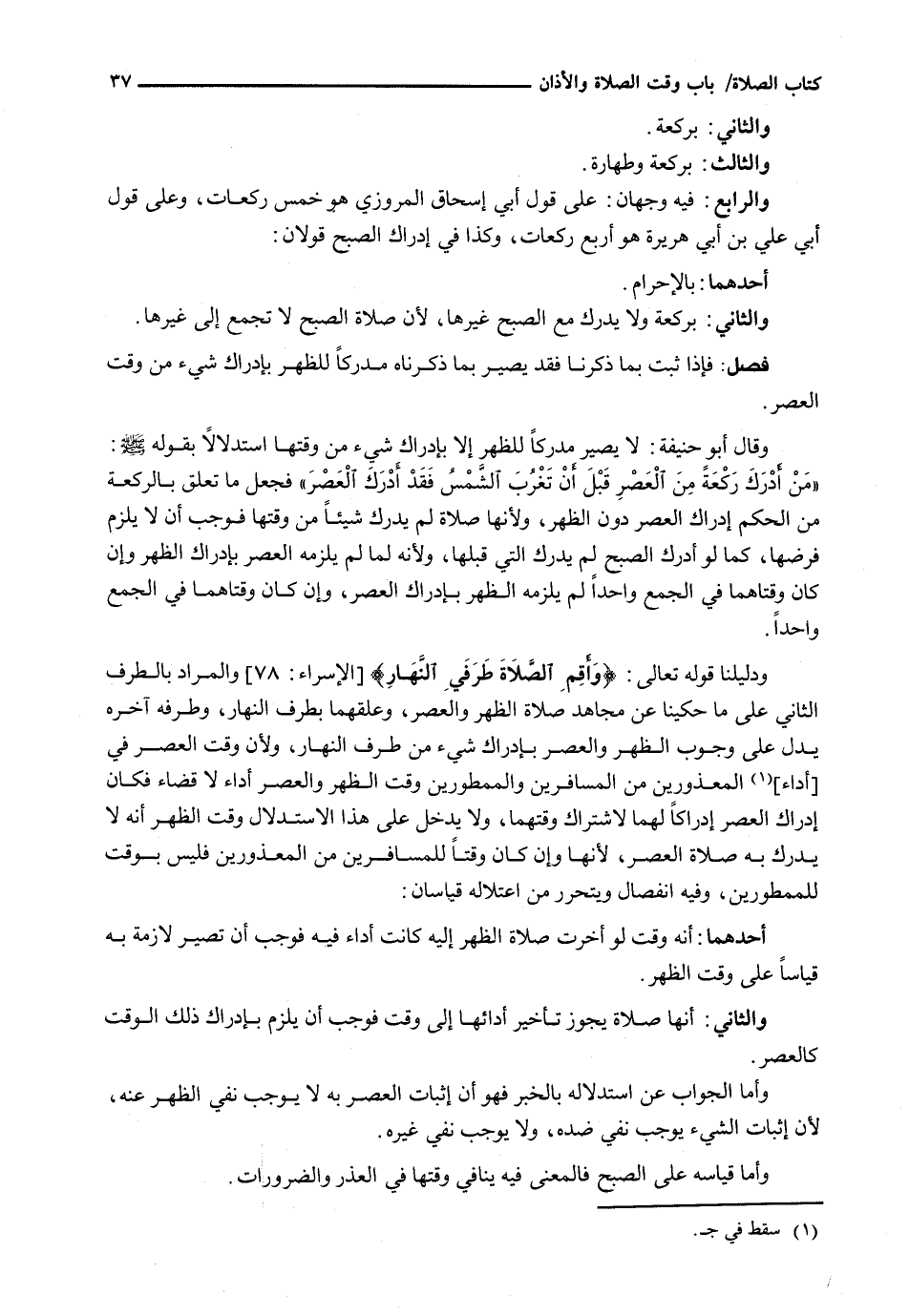 وَقَالَ أبو حنيفة: لَا يَصِيرُ مُدْرِكًا لِلظُّهْرِ إِلَّا بِإِدْرَاكِ شَيْءٍ مِنْ وَقْتِهَا اسْتِدْلَالًا بِقَوْلِهِ - صَلَّى اللَّهُ عَلَيْهِ وَسَلَّم َ -: " مَنْ أَدْرَكَ رَكْعَةً مِنَ الْعَصْرِ قَبْلَ أَنْ تَغْرُبَ الشَمْسُ فَقَدْ أَدْرَكَ الْعَصْرَ " فَجَعَلَ مَا تَعَلَّقَ بِالرَّكْعَةِ مِنَ الْحُكْمِ إِدْرَاكَ الْعَصْرِ دُونَ الظُّهْرِ، وَلِأَنَّهَا صَلَاةٌ لَمْ يُدْرِكْ شَيْئًا مِنْ وَقْتِهَا فَوَجَبَ أَنْ لَا يَلْزَمَ فَرْضَهَا، كَمَا لَوْ أَدْرَكَ الصُّبْحَ لَمْ يُدْرِكِ الَّتِي قَبْلَهَا، وَلِأَنَّهُ لَمَّا لَمْ يَلْزَمْهُ الْعَصْرُ بِإِدْرَاكِ الظُّهْرِ وَإِنْ كَانَ وَقْتَاهُمَا فِي الْجَمْعِ وَاحِدًا لَمْ يَلْزَمْهُ الظُّهْرُ بِإِدْرَاكِ الْعَصْرِ، وَإِنْ كَانَ وَقْتَاهُمَا فِي الْجَمْعِ وَاحِدًا.