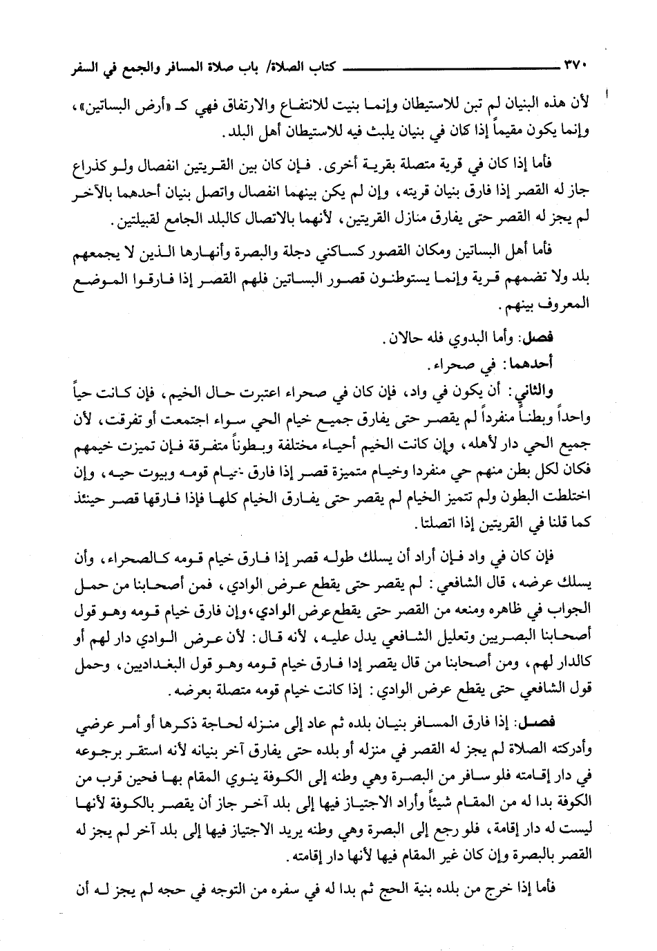 وَالثَّانِي: أَنْ يَكُونَ فِي وادٍ، فَإِنْ كَانَ فِي صحراء اعتبرت حَالُ الْخِيَمِ، فَإِنْ كَانَتْ حَيًّا وَاحِدًا وَبَطْنًا مُنْفَرِدًا لَمْ يَقْصُرْ حَتَّى يُفَارِقَ جَمِيعَ خِيَامِ الْحَيِّ سَوَاءٌ اجْتَمَعَتْ أَوْ تَفَرَّقَتْ، لِأَنَّ جَمِيعَ الْحَيِّ دَارٌ لِأَهْلِهِ، وَإِنْ كَانَتِ الْخِيَمُ أَحْيَاءً مُخْتَلِفَةً وَبُطُونًا مُتَفَرِّقَةً فَإِنْ تَمَيَّزَتْ خِيَمُهُمْ فَكَانَ لكل بطن منهم حي منفرداً وَخِيَامٌ مُتَمَيِّزَةٌ قَصَرَ إِذَا فَارَقَ خِيَامَ قَوْمِهِ وَبُيُوتَ حَيِّهِ، وَإِنِ اخْتَلَطَتِ الْبُطُونُ وَلَمْ تَتَمَيَّزِ الْخِيَامُ لَمْ يَقْصُرْ حَتَّى يُفَارِقَ الْخِيَامَ كُلَّهَا فَإِذَا فَارَقَهَا قَصَرَ حينئذٍ كَمَا قُلْنَا فِي الْقَرْيَتَيْنِ إِذَا اتَّصَلَتَا