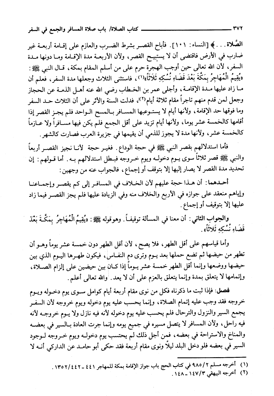 فَأَمَّا اسْتِدْلَالُهُمْ بِقَصْرِ النبي - صَلَّى اللَّهُ عَلَيْهِ وَسَلَّم َ - فِي حَجَّةِ الْوَدَاعِ. فَغَيْرُ حُجَّةٍ لِأَنَّا نُجِيزُ الْقَصْرَ أَرْبَعًا وَالنَّبِيُّ - صَلَّى اللَّهُ عَلَيْهِ وَسَلَّم َ - قَصَرَ ثَلَاثًا سِوَى يَوْمِ دُخُولِهِ وَيَوْمِ خُرُوجِهِ فَبَطَلَ اسْتِدْلَالُهُمْ بِهِ. أَمَّا قَوْلُهُمْ: إِنَّ تَحْدِيدَ مدة القصر لا يصار إليها إلا بالتوقف أَوْ إِجْمَاعٍ، فَالْجَوَابُ عَنْهُ مِنْ وَجْهَيْنِ: