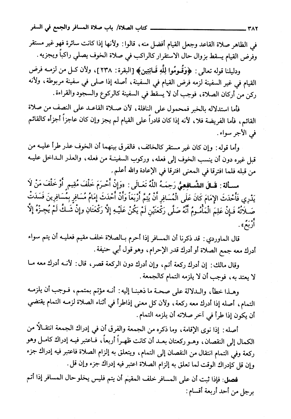 وَدَلِيلُنَا قَوْله تَعَالَى: {وَقُومُوا لِلَّهِ قَانِتِينَ} [البقرة: 238] ، وَلِأَنَّ كُلَّ مَنْ لَزِمَهُ فَرْضُ الْقِيَامِ فِي غَيْرِ السَّفِينَةِ لَزِمَهُ فَرْضُ الْقِيَامِ فِي السَّفِينَةِ، أَصْلُهُ إِذَا صَلَّى فِي سَفِينَةٍ مَرْبُوطَةٍ، وَلِأَنَّهُ رُكْنٌ مِنْ أَرْكَانِ الصَّلَاةِ، فَوَجَبَ أَنْ لَا يَسْقُطَ فِي السَّفِينَةِ كَالرُّكُوعِ وَالسُّجُودِ وَالْقِرَاءَةِ