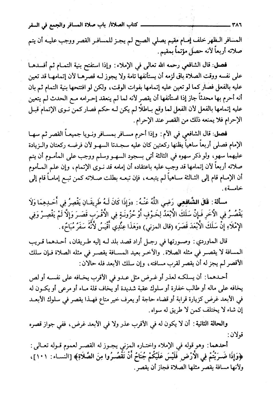 : قال الشافعي رضي الله عنه: " وَإِذَا كَانَ لَهُ طَرِيقَانِ يَقْصُرُ فِي أَحَدِهِمَا وَلَا يَقْصُرُ فِي الْآخَرِ فَإِنْ سَلَكَ الْأَبْعَدَ لِخَوْفٍ أَوْ حُزُونَةٍ فِي الْأَقْرَبِ قَصَرَ وَإِلَّا لَمْ يَقْصُرْ وَفِي الْإِمْلَاءِ إِنْ سَلَكَ الْأَبْعَدَ قَصَرَ " (قَالَ الْمُزَنِيُّ) " وَهَذَا عِنْدِي أَقْيَسُ لِأَنَّهُ سَفَرٌ مُبَاحٌ "