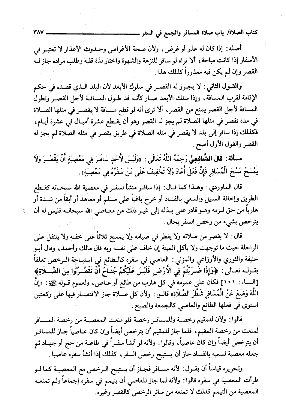 قَالَ الْمَاوَرْدِيُّ: وَهَذَا كَمَا قَالَ: إِذَا سَافَرَ منشأ لِسَفَرٍ فِي مَعْصِيَةِ اللَّهِ سُبْحَانَهُ كَقَطْعِ الطَّرِيقِ وَإِخَافَةِ السَّبِيلِ وَالسَّعْيِ بِالْفَسَادِ أَوْ خَرَجَ بَاغِيًا عَلَى مُسْلِمٍ أَوْ مُعَاهَدٍ أَوْ أَبَقًا مِنْ شِدَّةٍ أَوْ هَارِبًا مِنْ حَقٍّ لَزِمَهُ وَهُوَ قَادِرٌ عَلَى بَذْلِهِ إِلَى غَيْرِ ذَلِكَ مِنْ مَعَاصِي اللَّهِ سُبْحَانَهُ فَلَيْسَ لَهُ أَنْ يَتَرَخَّصَ بِشَيْءٍ مِنْ رُخَصِ السَّفَرِ بِحَالٍ