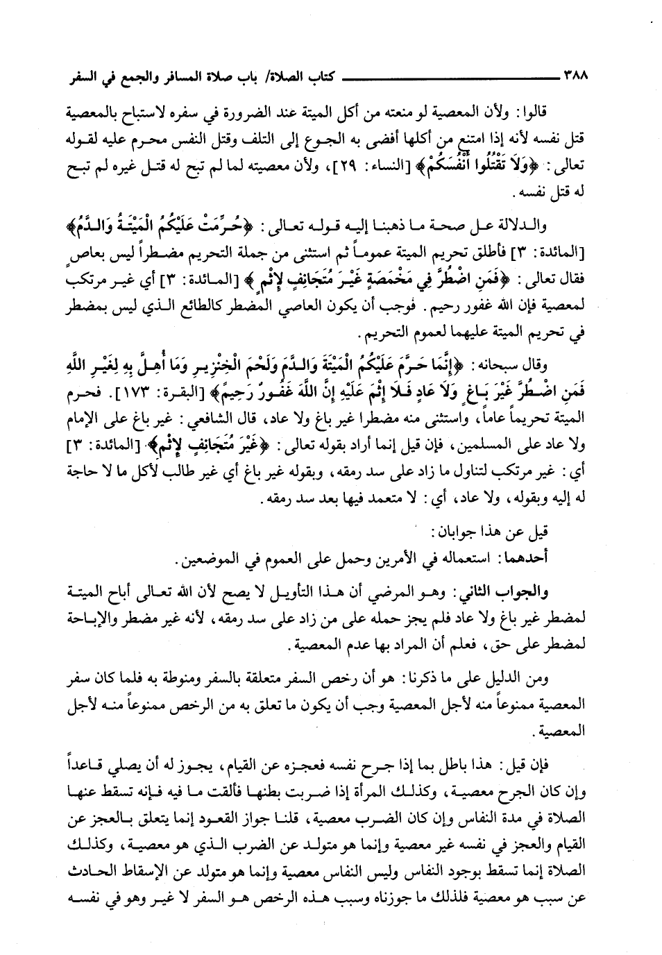 وَقَالَ سُبْحَانَهُ: {إِنَّمَا حَرَّمَ عَلَيْكُمُ الْمَيْتَةَ وَالدَّمَ وَلَحْمَ الْخِنْزِيرِ وَمَا أُهِلَّ بِهِ لِغَيْرِ اللَّهِ فَمَنِ اضْطُرَّ غَيْرَ بَاغٍ وَلا عَادٍ فَلا إِثْمَ عَلَيْهِ إِنَّ اللَّهَ غَفُورٌ رَحِيمٌ} [البقرة: 173] . فَحَرَّمَ الْمَيْتَةَ تَحْرِيمًا عَامًّا، وَاسْتَثْنَى مِنْهُ مُضْطَرًّا غَيْرَ بَاغٍ وَلَا عَادٍ، قَالَ الشَّافِعِيُّ: غَيْرُ بَاغٍ عَلَى الْإِمَامِ وَلَا عَادٍ عَلَى الْمُسْلِمِينَ، فَإِنْ قِيلَ إِنَّمَا أَرَادَ بِقَوْلِهِ تَعَالَى: {غَيْرَ مُتَجَانِفٍ لإِثْمٍ} [المائدة: 3] أَيْ: غَيْرَ مُرْتَكِبٍ لِتَنَاوُلِ مَا زَادَ عَلَى سَدِّ رَمَقِهِ، وَبِقَوْلِهِ غَيْرَ بَاغٍ أَيْ غَيْرَ طَالِبٍ لِأَكْلِ مَا لَا حَاجَةَ لَهُ إِلَيْهِ وَبِقَوْلِهِ، وَلَا عَادٍ، أَيْ: لَا مُتَعَمِّدٍ فِيهَا بَعْدَ سَدِّ رَمَقِهِ
