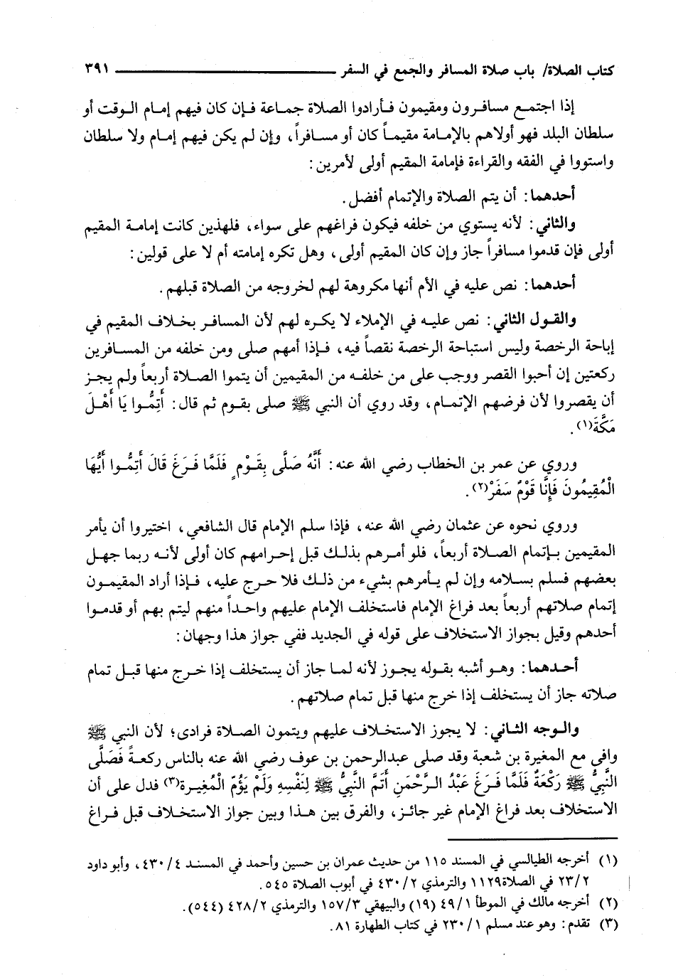 إِذَا اجْتَمَعَ مُسَافِرُونَ وَمُقِيمُونَ فَأَرَادُوا الصَّلَاةَ جَمَاعَةً فإن كان فيهم إمام الوقت أن سُلْطَانُ الْبَلَدِ فَهُوَ أَوْلَاهُمْ بِالْإِمَامَةِ مُقِيمًا كَانَ أَوْ مُسَافِرًا، وَإِنْ لَمْ يَكُنْ فِيهِمْ إِمَامٌ وَلَا سُلْطَانٌ وَاسْتَوَوْا فِي الْفِقْهِ وَالْقِرَاءَةِ فَإِمَامَةُ المقيم أولى لأمرين: