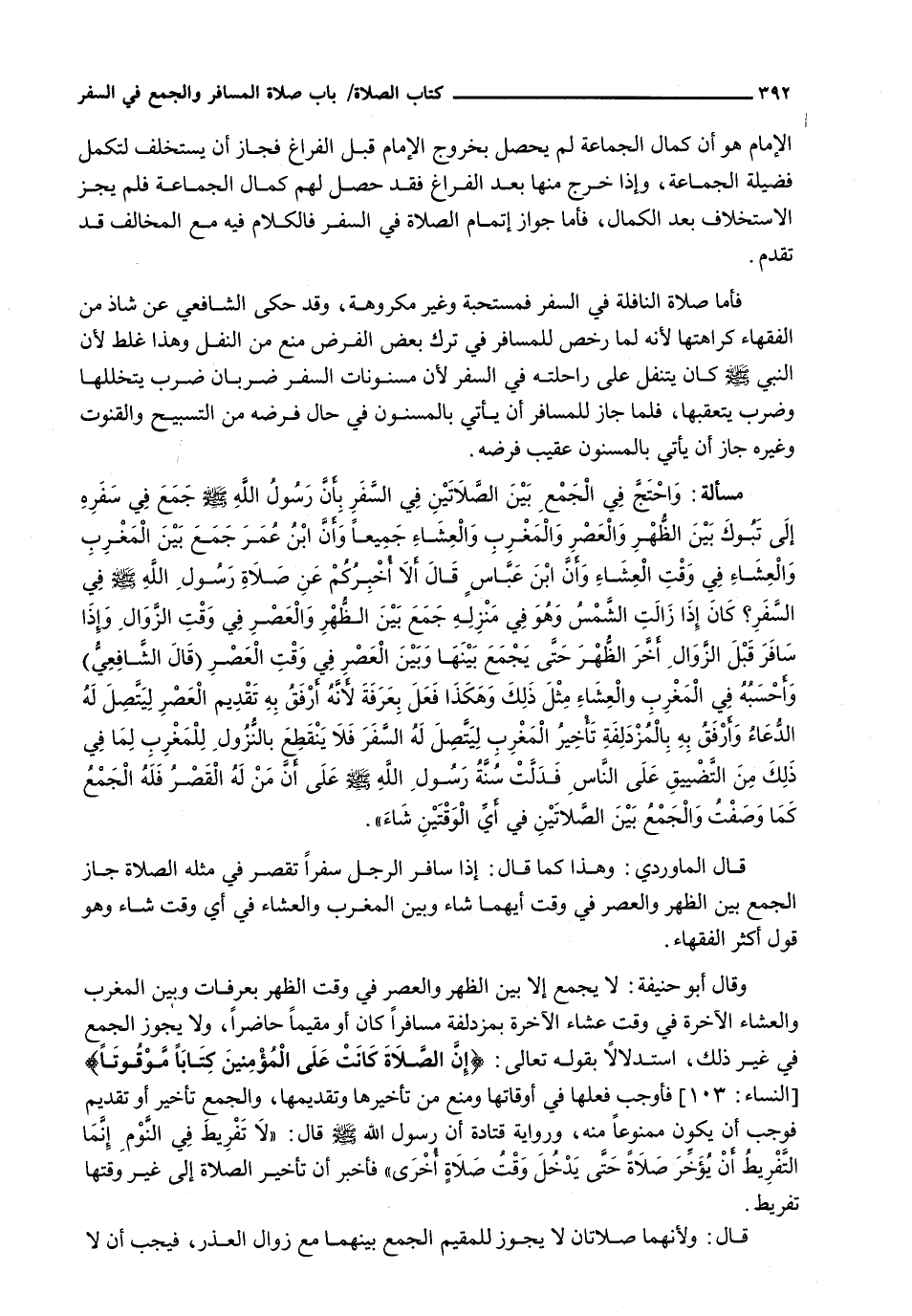 قَالَ الْمَاوَرْدِيُّ: وَهَذَا كَمَا قَالَ: إِذَا سَافَرَ الرَّجُلُ سَفَرًا تُقْصَرُ فِي مِثْلِهِ الصَّلَاةُ جَازَ الْجَمْعُ بَيْنَ الظُّهْرِ وَالْعَصْرِ فِي وَقْتِ أَيِّهِمَا شَاءَ وَبَيْنَ الْمَغْرِبِ وَالْعِشَاءِ فِي أَيِّ وَقْتٍ شَاءَ وَهُوَ قَوْلُ أَكْثَرِ الْفُقَهَاءِ