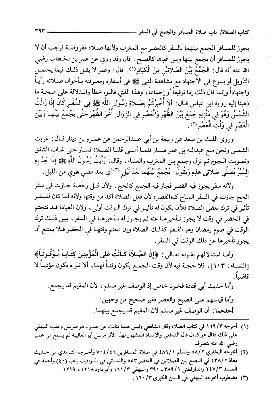 يَجُوزَ لِلْمُسَافِرِ الْجَمْعُ بَيْنَهُمَا بِالسَّفَرِ كَالْعَصْرِ مَعَ الْمَغْرِبِ وَلِأَنَّهَا صَلَاةٌ مَفْرُوضَةٌ فَوَجَبَ أَنْ لَا يجوز للمسافر أن يجمع بينها وبين غدها كَالصُّبْحِ. قَالَ وَقَدْ رُوِيَ عَنْ عُمَرَ بْنِ الْخَطَّابِ رَضِيَ اللَّهُ عَنْهُ أَنَّهُ قَالَ: الْجَمْعُ بَيْنَ الصَّلَاتَيْنِ مِنَ الْكَبَائِرِ. قَالَ: وَعُمَرُ لَا يَقْبَلُ ذَلِكَ فِيمَا يَحْتَمِلُ التَّأْوِيلَ أَوْ يَسُوغُ فِي الِاجْتِهَادِ مَعَ مُشَاهَدَةِ النَّبِيِّ - صَلَّى اللَّهُ عَلَيْهِ وَسَلَّم َ - فِي أَسْفَارِهِ وَمَعْرِفَتِهِ بِأَحْوَالِ صَلَاتِهِ رَأْيًا وَاجْتِهَادًا وَإِنَّمَا قَالَ ذَلِكَ إِمَّا تَوْقِيفًا أَوْ إِجْمَاعًا، وهذا الذي قالوا خَطَأٌ وِالدَّلَالَةُ عَلَى صِحَّةِ مَا ذَهَبْنَا إِلَيْهِ رِوَايَةُ ابْنِ عَبَّاسٍ قَالَ: أَلَا أُخْبِرُكُمْ بِصَلَاةِ رَسُولِ اللَّهِ - صَلَّى اللَّهُ عَلَيْهِ وَسَلَّم َ - فِي السَّفَرِ كَانَ إِذَا زَالَتِ الشَّمْسُ وَهُوَ فِي مَنْزِلِهِ جَمَعَ بَيْنَ الظُّهْرِ وَالْعَصْرِ فِي الزَّوَالِ أَخَّرَ الظُّهْرَ حَتَّى يَجْمَعَ بَيْنَهَا وَبَيْنَ الْعَصْرِ فِي وَقْتِ الْعَصْرِ