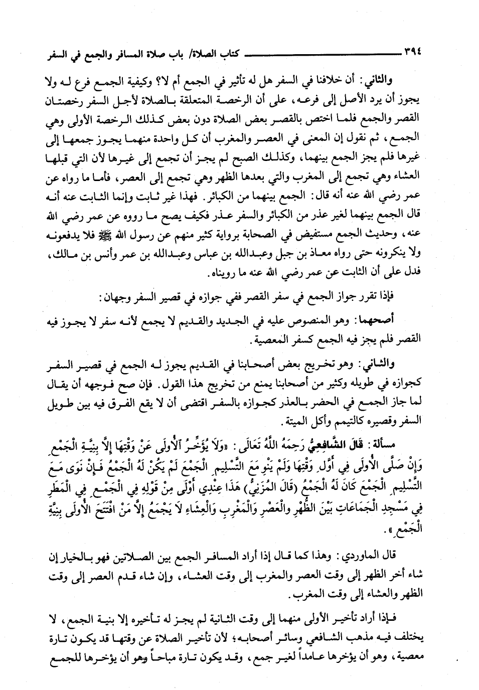 وَالثَّانِي: أَنَّ خِلَافَنَا فِي السَّفَرِ هَلْ لَهُ تَأْثِيرٌ فِي الْجَمْعِ أَمْ لَا؟ وَكَيْفِيَّةُ الْجَمْعِ فَرْعٌ لَهُ وَلَا يَجُوزُ أَنْ يُرَدَّ الْأَصْلُ إِلَى فَرْعِهِ، عَلَى أَنَّ الرُّخْصَةَ الْمُتَعَلِّقَةَ بِالصَّلَاةِ لِأَجْلِ السَّفَرِ رُخْصَتَانِ الْقَصْرُ وَالْجَمْعُ فَلَمَّا اخْتَصَّ بِالْقَصْرِ بَعْضُ الصَّلَاةِ دُونَ بَعْضٍ كَذَلِكَ الرُّخْصَةُ الْأُولَى وَهِيَ الْجَمْعُ، ثُمَّ نَقُولُ إِنَّ الْمَعْنَى فِي الْعَصْرِ وَالْمَغْرِبِ أَنَّ كُلَّ وَاحِدَةٍ مِنْهُمَا يَجُوزُ جَمْعُهَا إِلَى غَيْرِهَا فَلَمْ يَجُزِ الْجَمْعُ بَيْنَهُمَا، وَكَذَلِكَ الصُّبْحُ لَمْ يَجُزْ أَنْ تُجْمَعَ إِلَى غَيْرِهَا لِأَنَّ الَّتِي قَبْلَهَا الْعِشَاءُ وَهِيَ تُجْمَعُ إِلَى الْمَغْرِبِ وَالَّتِي بَعْدَهَا الظُّهْرُ وَهِيَ تُجْمَعُ إِلَى الْعَصْرِ، فَأَمَّا مَا رَوَاهُ عَنْ عُمَرَ رَضِيَ اللَّهُ عَنْهُ أَنَّهُ قَالَ: الْجَمْعُ بَيْنَهُمَا مِنَ الْكَبَائِرِ. فَهَذَا غَيْرُ ثَابِتٍ وَإِنَّمَا الثَّابِتُ عَنْهُ أَنَّهُ قَالَ الْجَمْعُ بَيْنَهُمَا لِغَيْرِ عُذْرٍ مِنَ الْكَبَائِرِ وَالسَّفَرُ عُذْرٌ فَكَيْفَ يَصِحُّ مَا رَوَوْهُ عَنْ عُمَرَ رَضِيَ اللَّهُ عَنْهُ، وَحَدِيثُ الْجَمْعِ مُسْتَفِيضٌ فِي الصَّحَابَةِ بِرِوَايَةِ كَثِيرٍ مِنْهُمْ عَنْ رَسُولِ اللَّهِ - صَلَّى اللَّهُ عَلَيْهِ وَسَلَّم َ - فَلَا يَدْفَعُونَهُ وَلَا يُنْكِرُونَهُ حَتَّى رَوَاهُ مُعَاذُ بْنُ جَبَلٍ وَعَبْدِ اللَّهِ بْنِ عَبَّاسٍ وَعَبْدِ اللَّهِ بْنِ عُمَرَ وَأَنَسُ بْنُ مَالِكٍ، فَدَلَّ عَلَى أَنَّ الثَّابِتَ عَنْ عُمَرَ رَضِيَ اللَّهُ عَنْهُ مَا رَوَيْنَاهُ